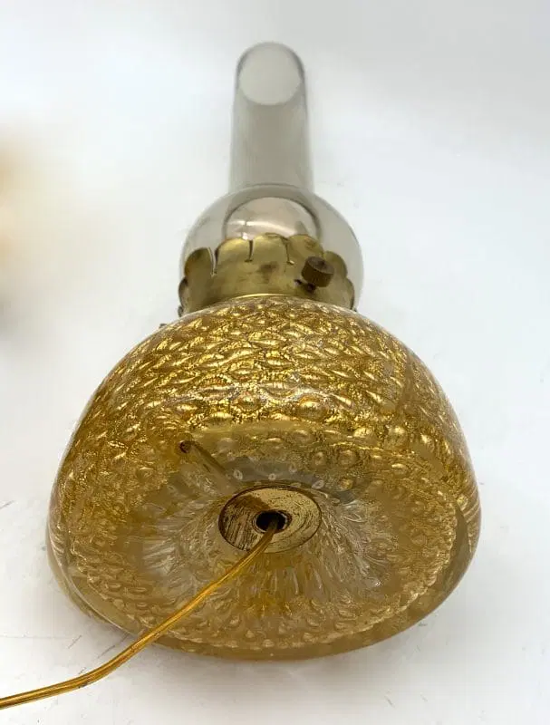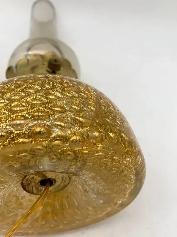 Lampade da tavolo in stile antico con base in vetro soffiato decorato color ambra/oro e manico laterale. Entrambe le lampade presentano inserti dorati con effetto murrina sommersa all’interno del vetro. La parte superiore è composta da una struttura in ottone dorato che regge un tubo di vetro trasparente fumé,