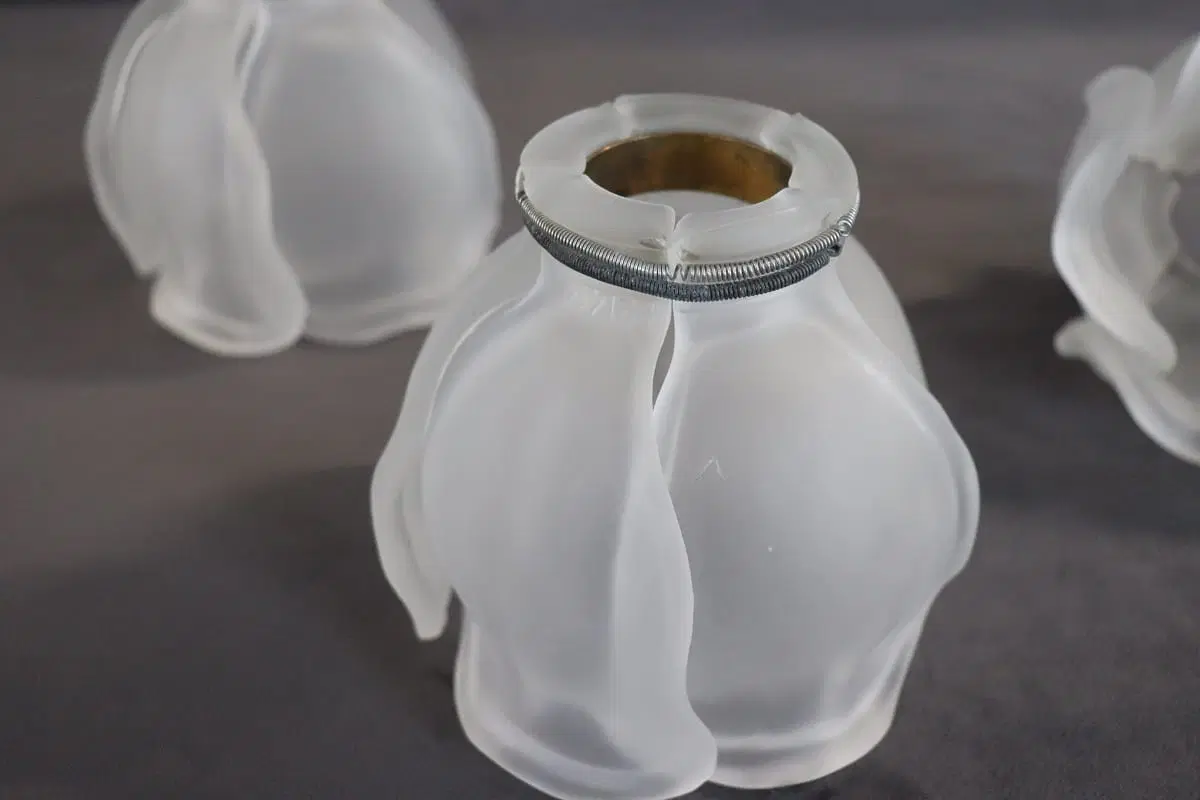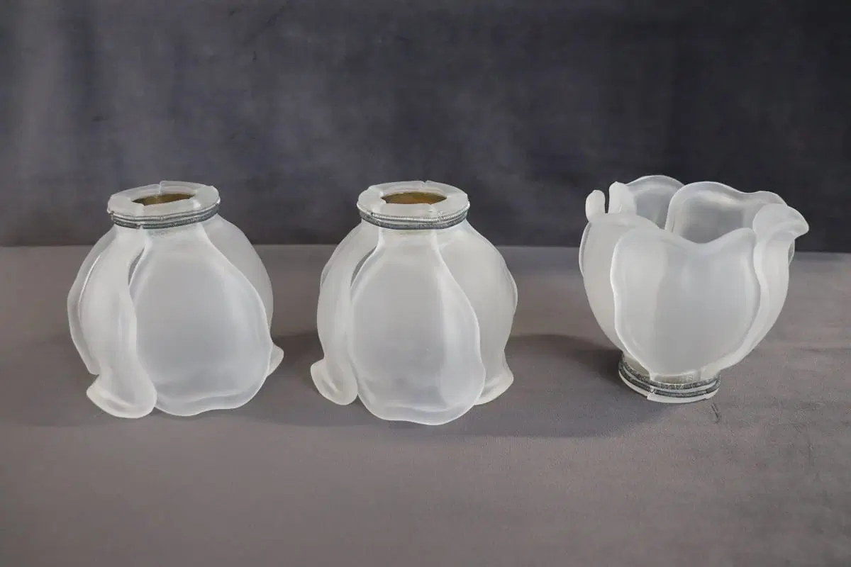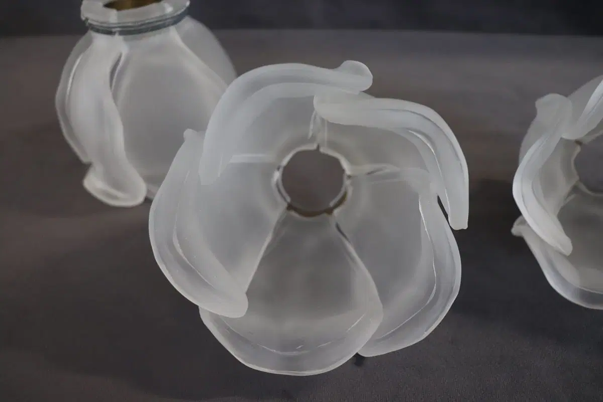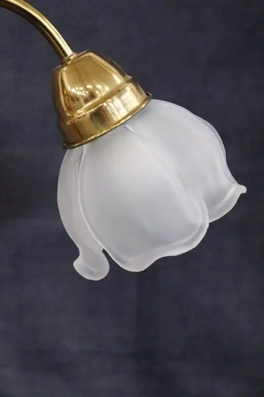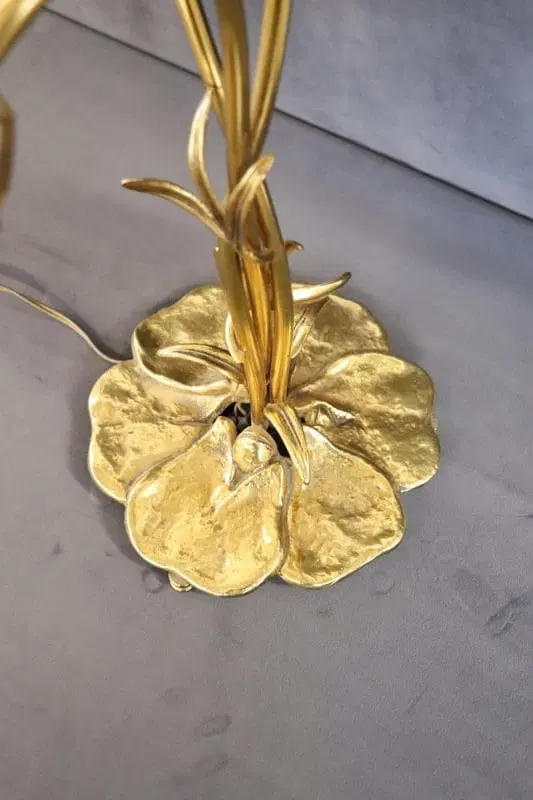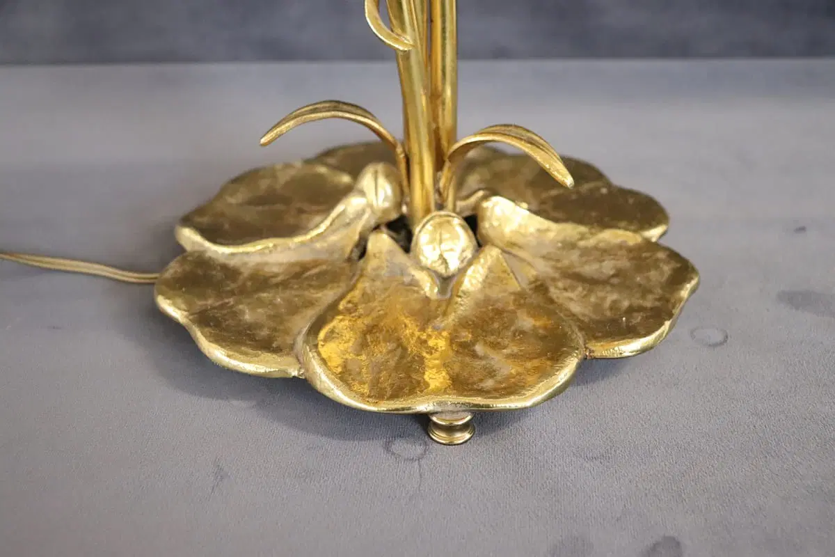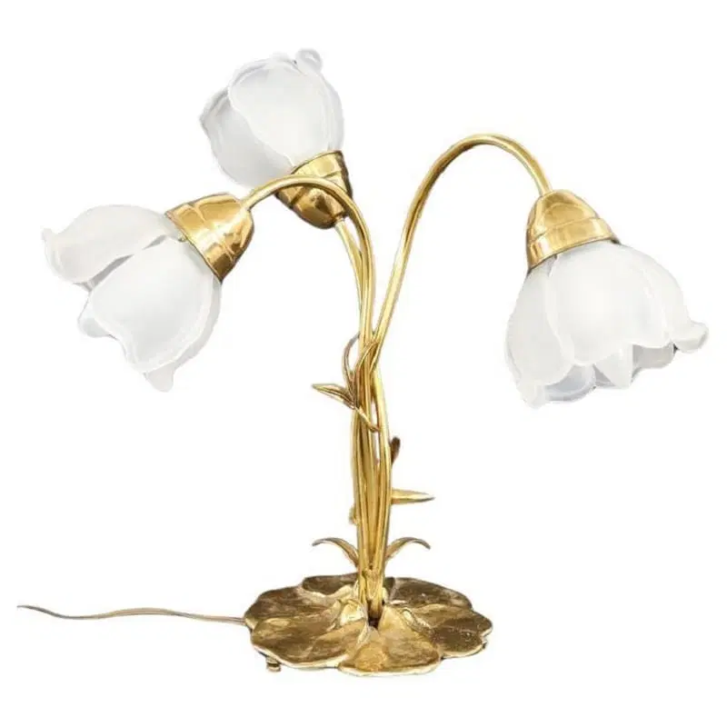 Bella lampada da tavolo in stile Art Nouveau realizzata negli anni ’80 circa. Dotata di tre luci. Il corpo è in raffinato ottone dorato, i paralumi sono petali di fiori in vetro satinato. Perfettamente funzionante. Ottime condizioni. Si prega di guardare tutte le foto in dettaglio. Prezzo trattabile inviateci la vostra migliore proposta di acquisto.