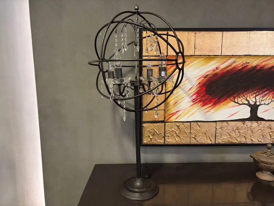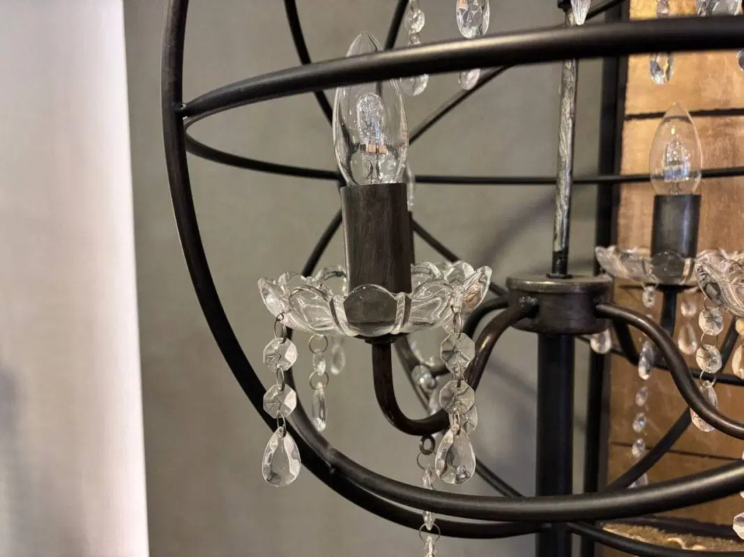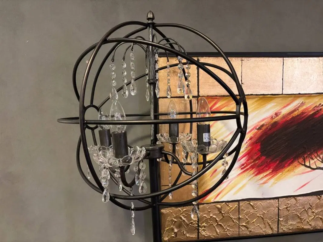 Lampada Dialma Brown realizzata in ferro battuto di forma sferica che richiama il movimento intorno al sole. Decorata con gocce di vetro. Adatta a molteplici ambientazioni come studio e zona Living
