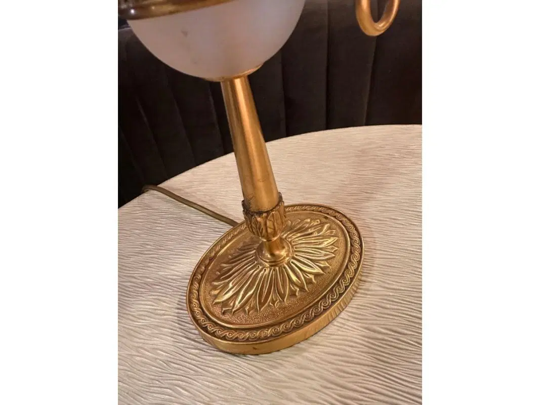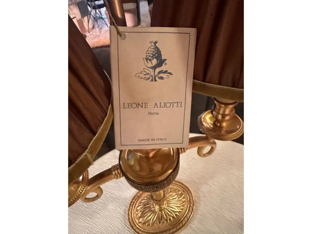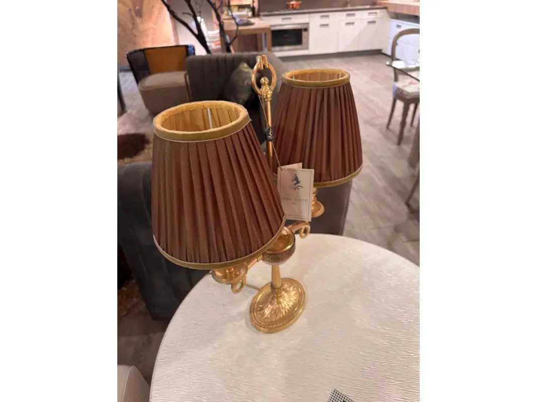 Lampada da tavolo realizzata in fusione di ottone satinato, da Maestri Artigiani, con paralumi in preziosi tessuti rifiniti a mano in Venezia. adatta per ambienti caldi ed eleganti.