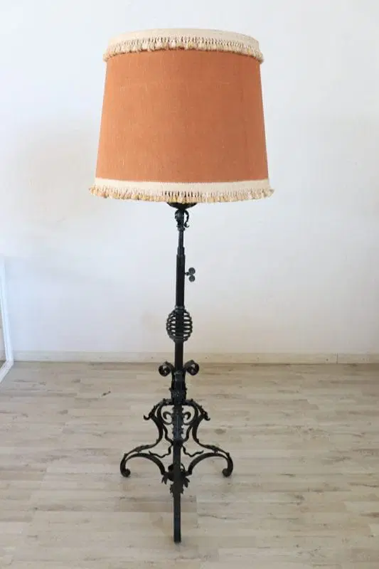 Bellissima lampada da terra in ferro battuto in stile Art Nouveau fine secolo XIX. Il corpo di questa lampada è una vera opera d’arte in ferro battuto. Il ferro ha una bella patina antica. Dotata di due lampadine. L’altezza è regolabile in base alle proprie esigenze e può raggiungere circa 237 cm. Segni di usura nel tessuto del paralume. Usata da segnalare alcuni difetti nel paralume. Impianto elettrico funzionante. Vi consigliamo comunque di guardare bene in dettaglio tutte le foto allegate . Proposto ad un’ottimo prezzo trattabile vi invitiamo ad inviarci le vostre proposte di acquisto le valuteremo con piacere.