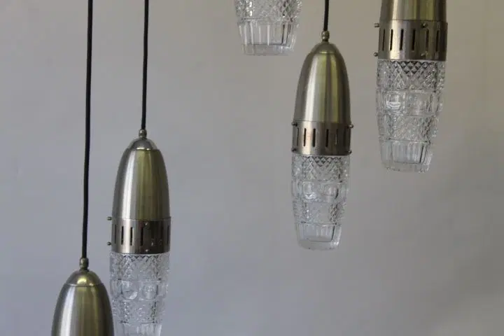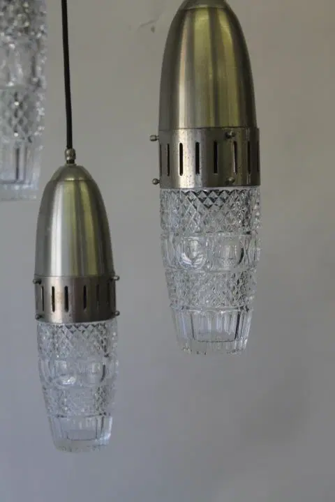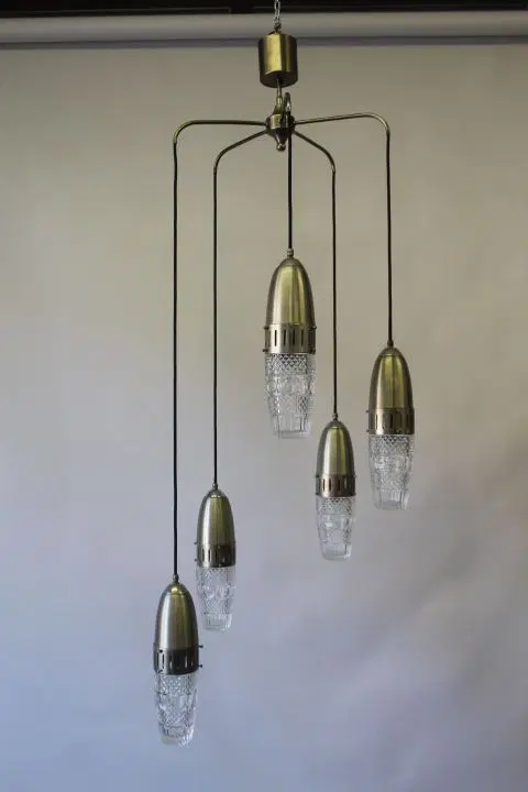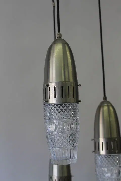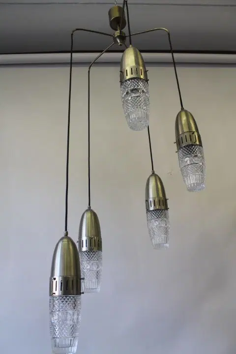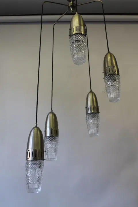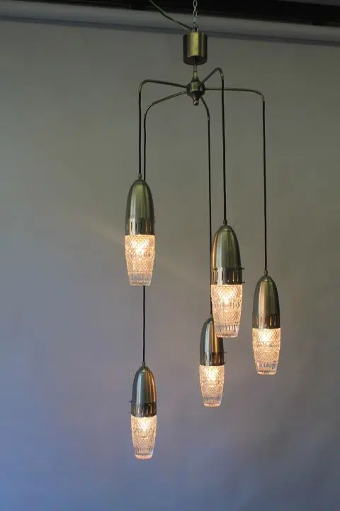 Bellissimo Lampadario Modernariato “Space Age “ anni 1960 , con cinque luci pendenti a sospensione in metallo cromato e vetri lavorati regolabili . completamente restaurato e elettrificato pronto da inserire in ambiente .