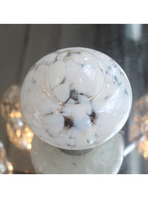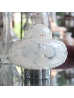 Modello: Coppia di lampade da comodino / Sembrano atterrate da un’altra galassia o sbocciate in un bosco: queste due lampade vintage in vetro soffiato, con la loro forma tondeggiante e fluttuante, evocano l’immaginario degli anni ’70, tra esplorazioni cosmiche e sogni psichedelici. Una ha il candore compatto della luna piena, l’altra gioca con trasparenze lattiginose e venature marmoree.
