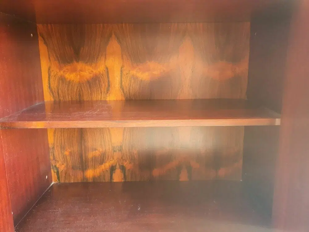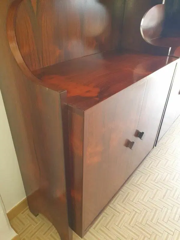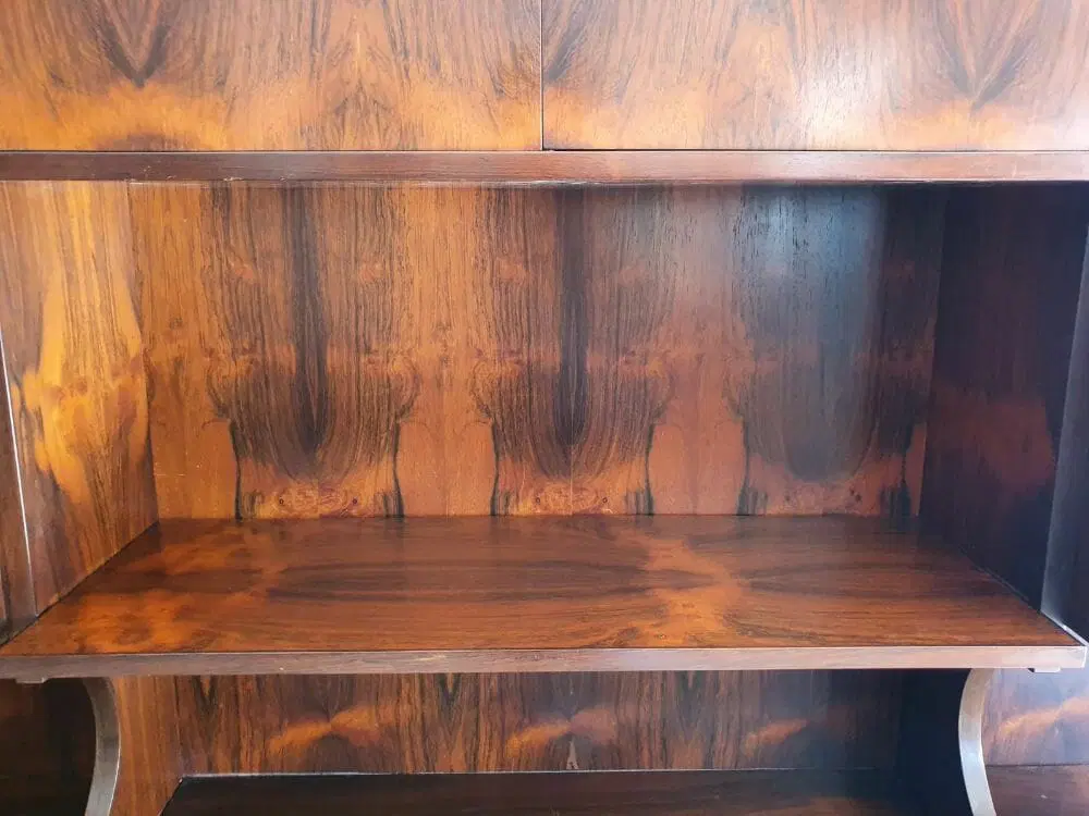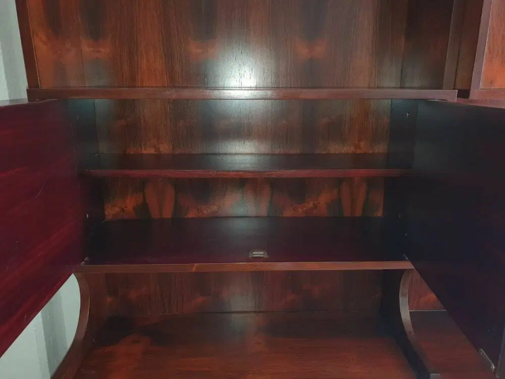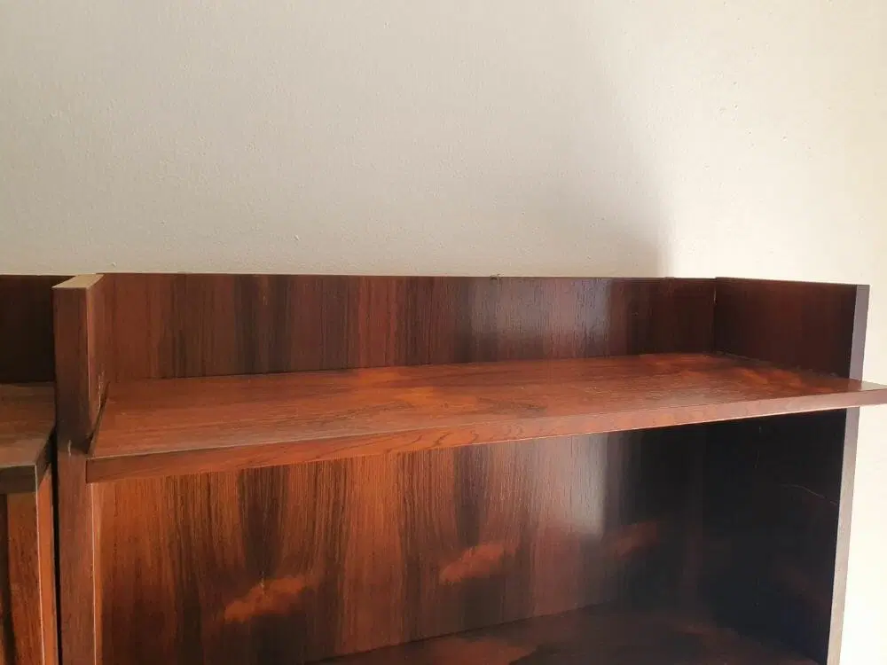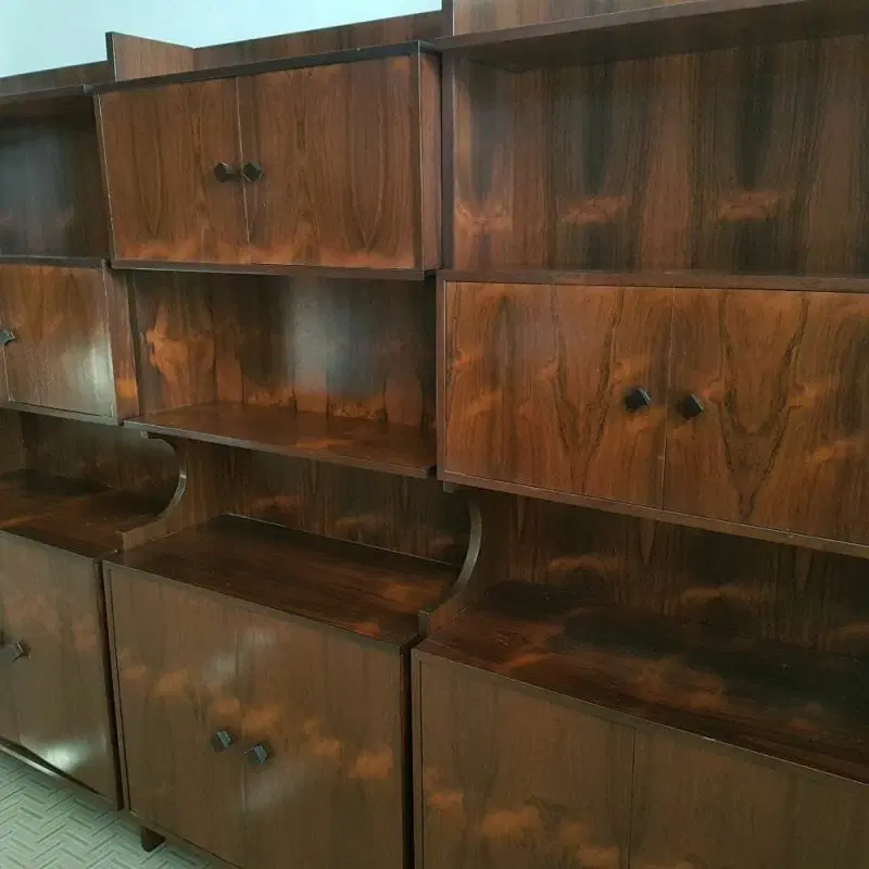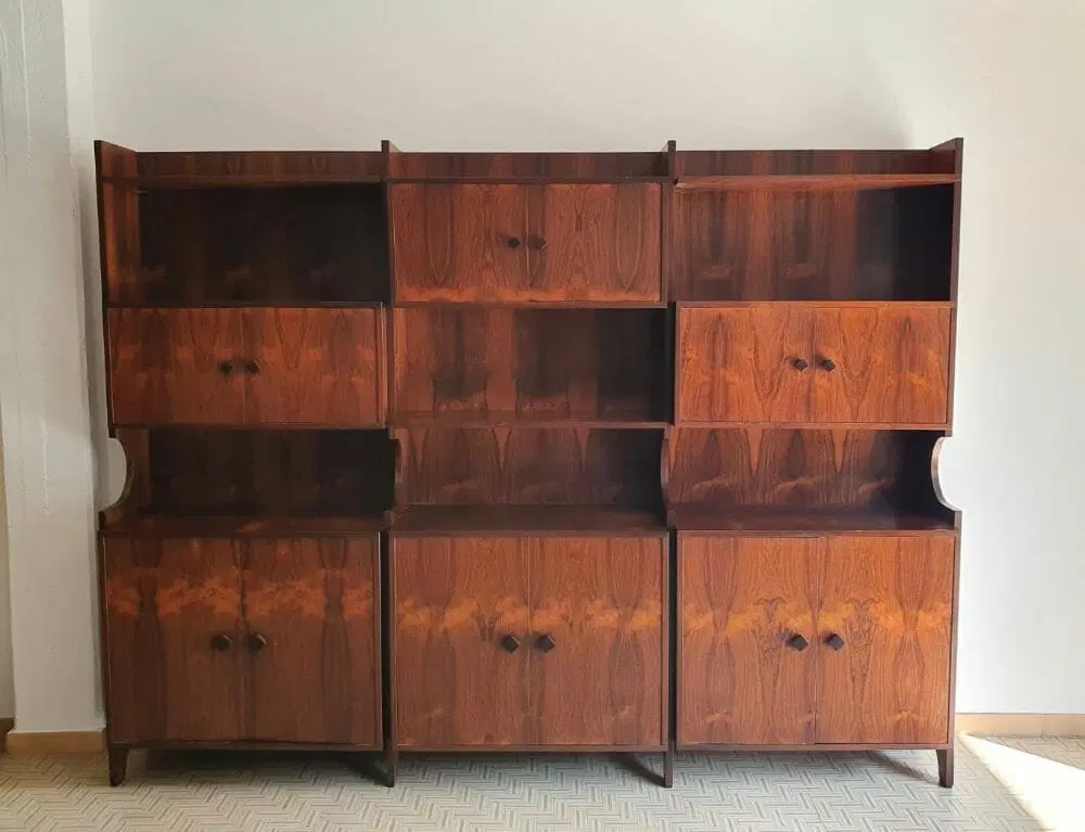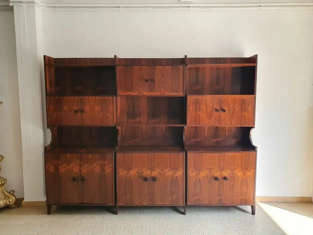 Bellissima liberia a parete originale degli anni ’60 di design moderno scandinavo ma produzione italiana, elegantemente rifinita in palissandro del brasile anche nelle parti esterne, completamente smontabile. Ottime condizioni di conservazione originali , presenta solo leggere imperfezioni dovute all’ utilizzo classico. Ripulita e risanata è pronta per essere utilizzata da subito. Viene spedita smontata