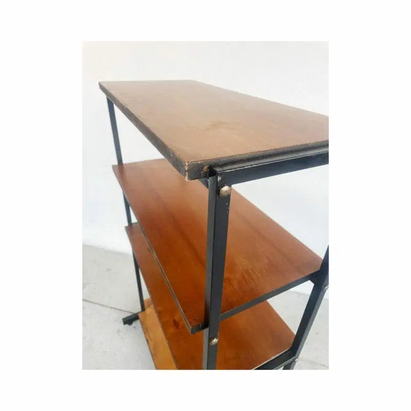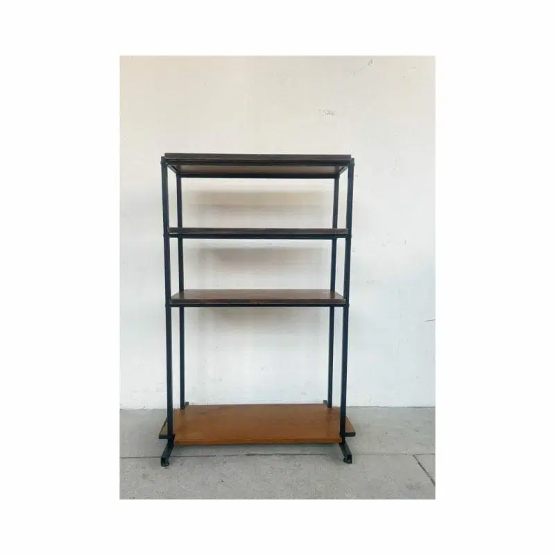 Libreria anni ’60, struttura in ferro nero, quattro ripiani in legno