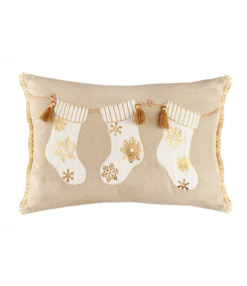 Il cuscino, finemente ricamato, presenta un motivo tipicamente natalizio: piccole calze appese ad un filo con elementi decorativi color oro.