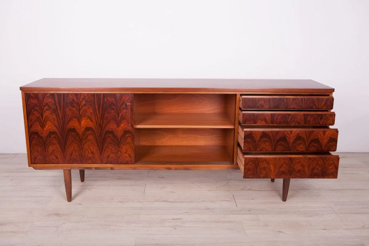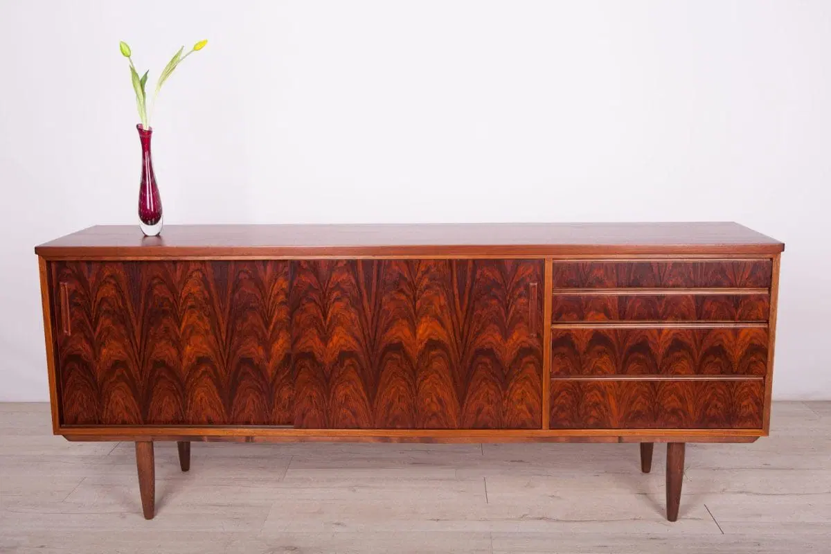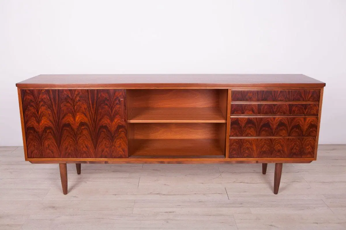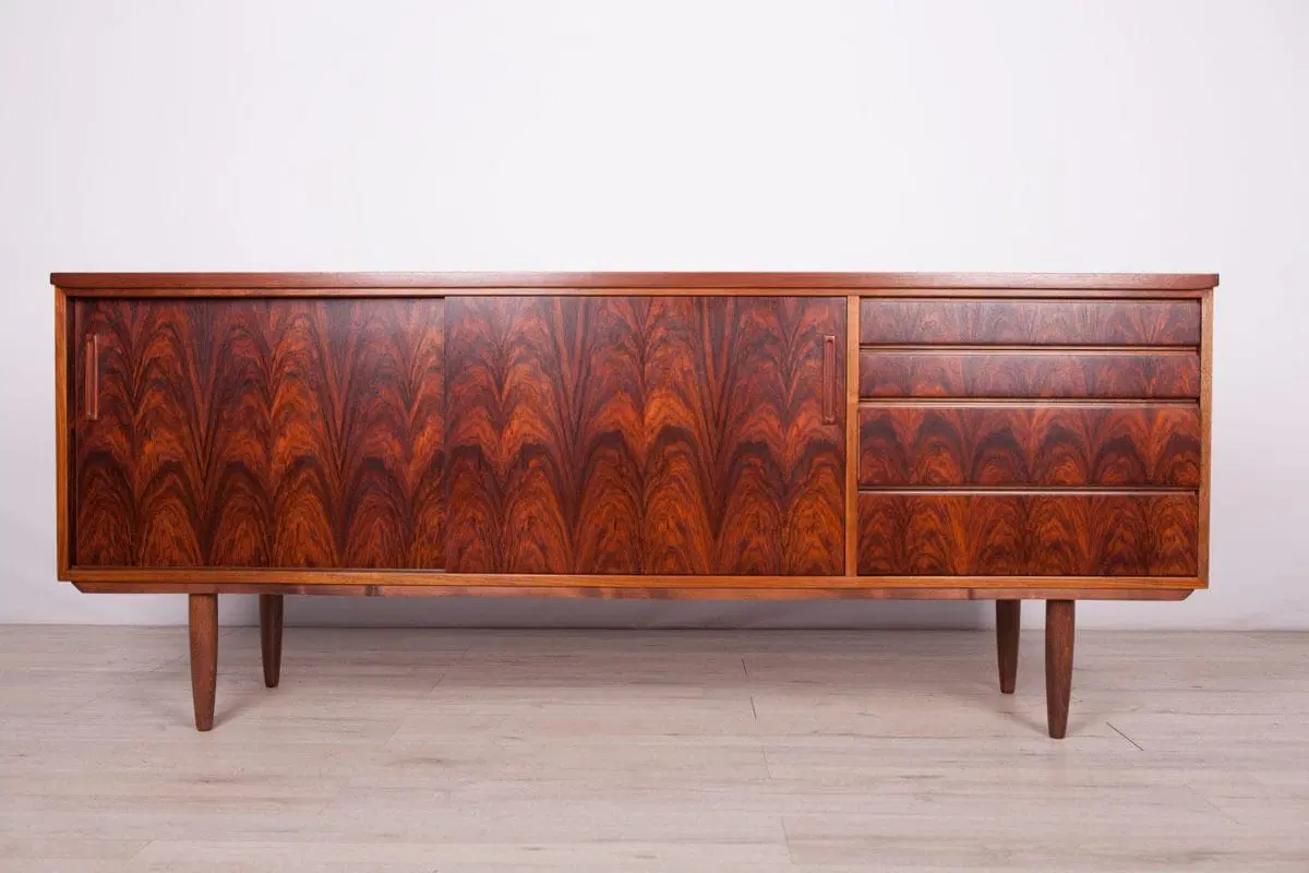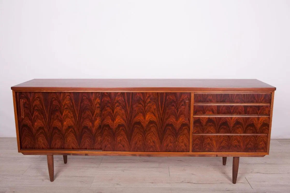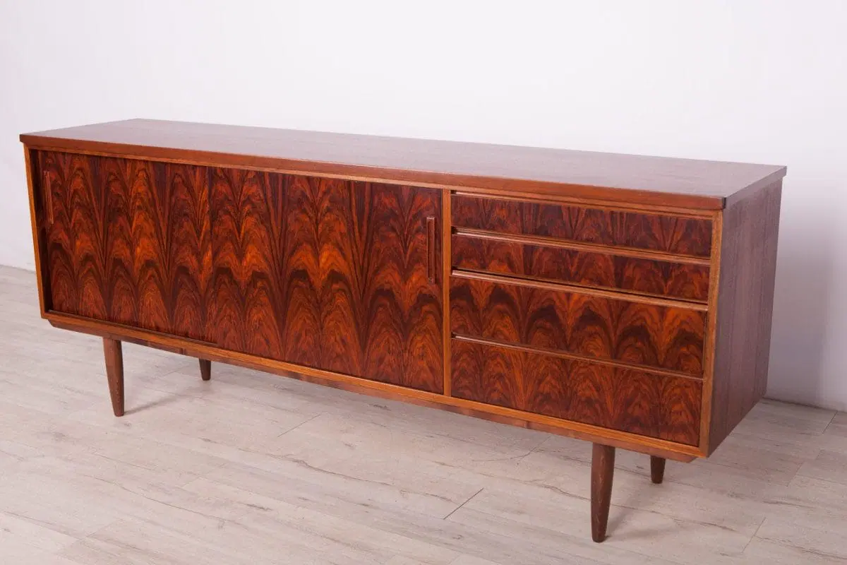 This mid century sideboard was produced in Denmark in the 1960s. A sideboard made of rosewood and mahogany wood. The sideboard consists of four drawers and a cabinet closed with two sliding doors. The wood have been cleaned and polished with Rustins Danish oil.