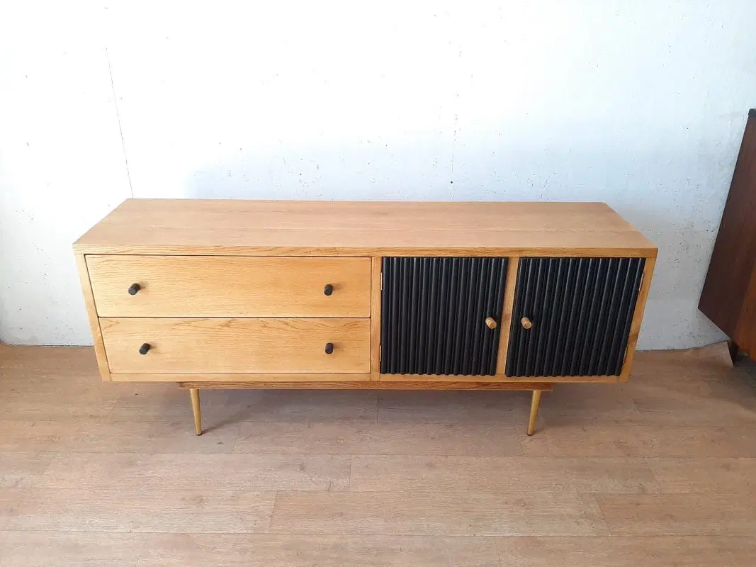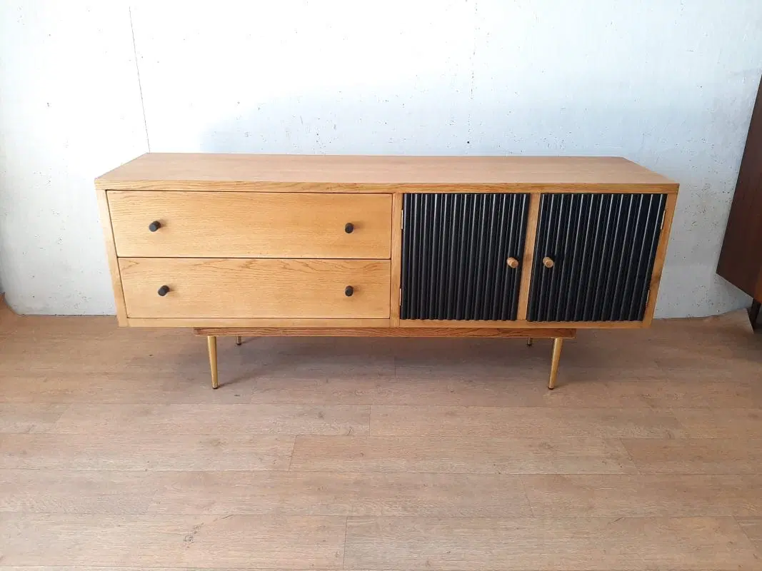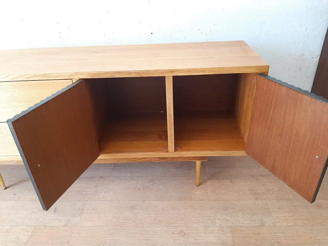 note: Mobile basso – crededenza dal design moderno costruito verso la metà del 1980. Mobile di altissima qualità tutto in rovere massello spesso oltre 3 cm! Molto pesante e di ottima fattura, piedi in ottone, finitura a legno naturale!