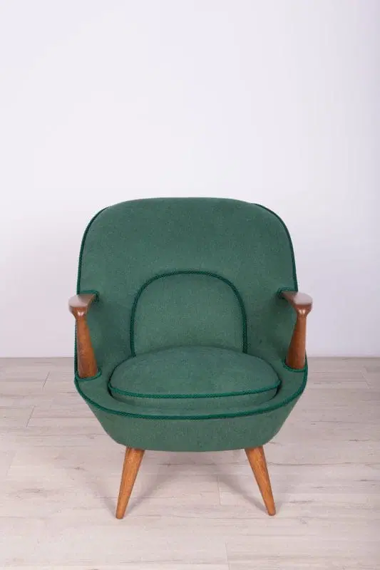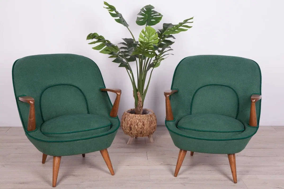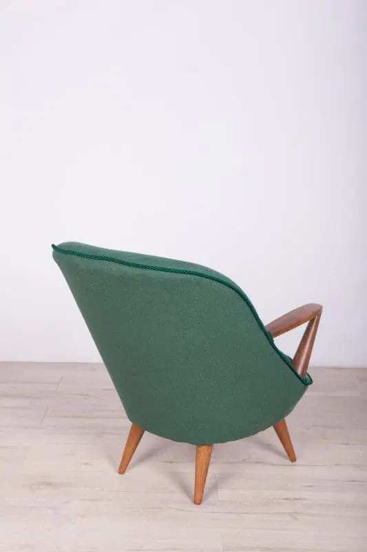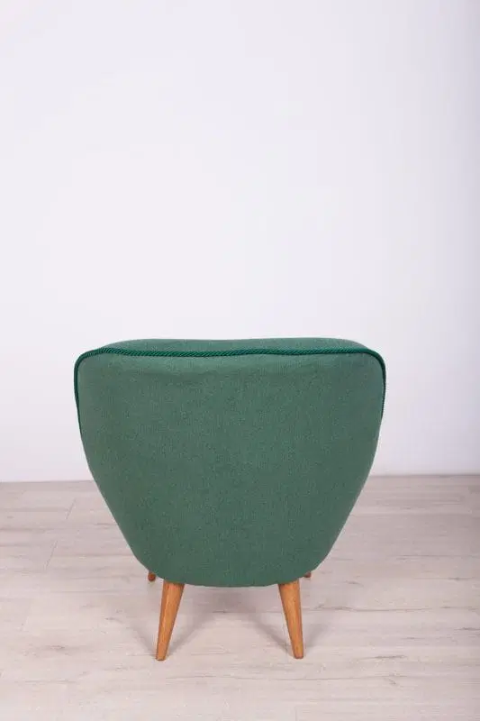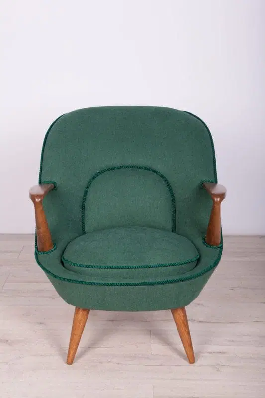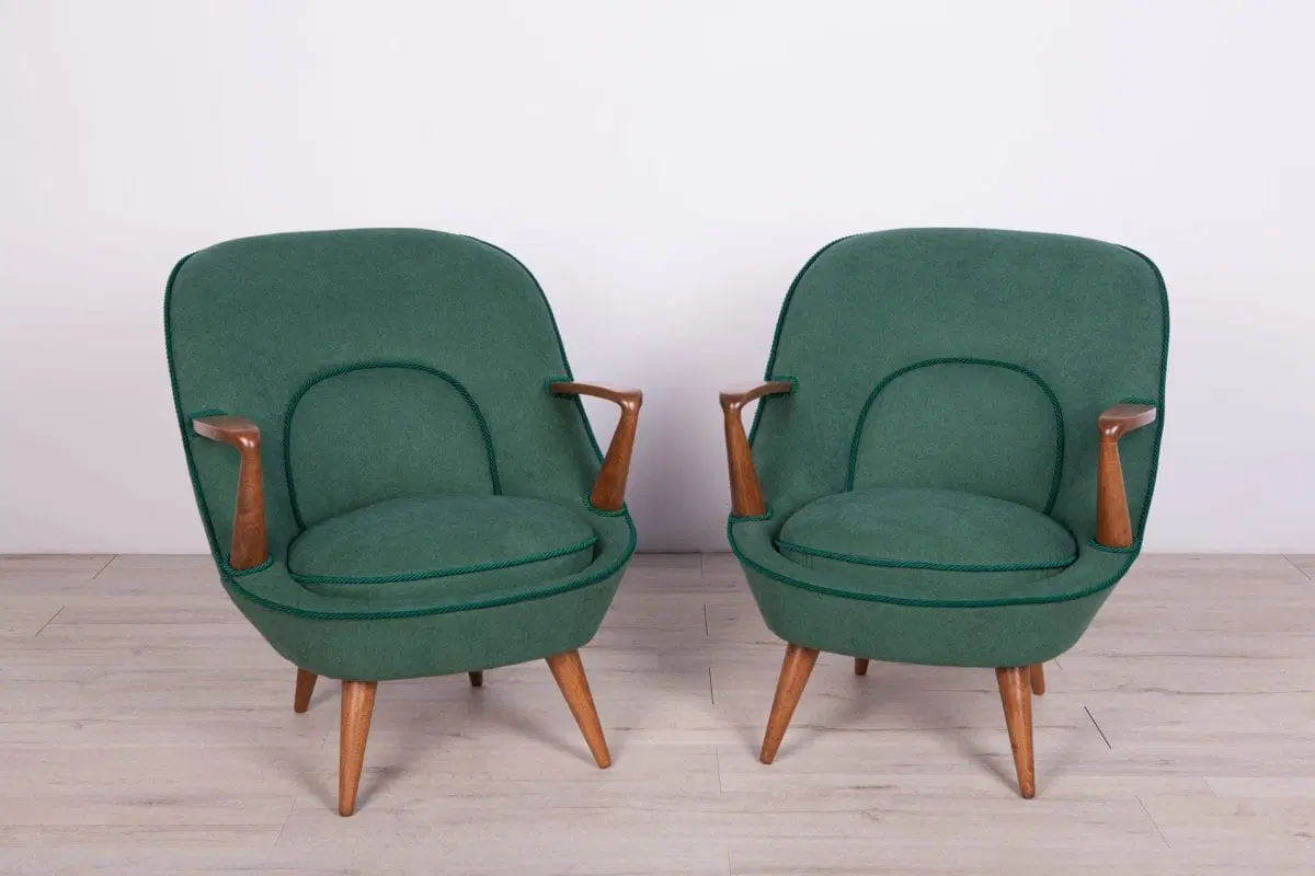 Konrad Racinowski manufactured by Poznan Furniture Factory. The armchairs debuted at the Poznań Fair in 1956. The wooden elements have been cleaned, painted with oak-colored mordant, and finished with semi-gloss lacquer. The upholstery elements have been changed and covered with a green fabric
