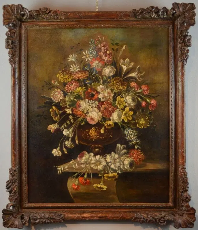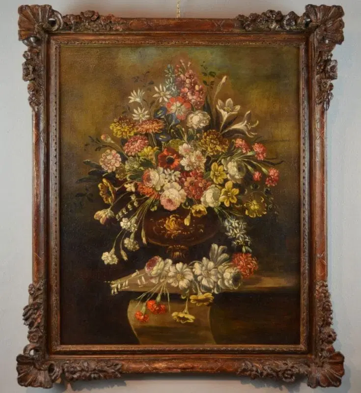 Dipinto raffigurante una ricca natura morta, di grande gusto decorativo, che colpisce per l’incredibile vivacità ed equilibrio della sua composizione. Il dipinto è di buona mano, distinto da una bel contrasto cromatico, evocando le nature morte seicentesche e settecentesche, specialmente di ambito fiorentino.