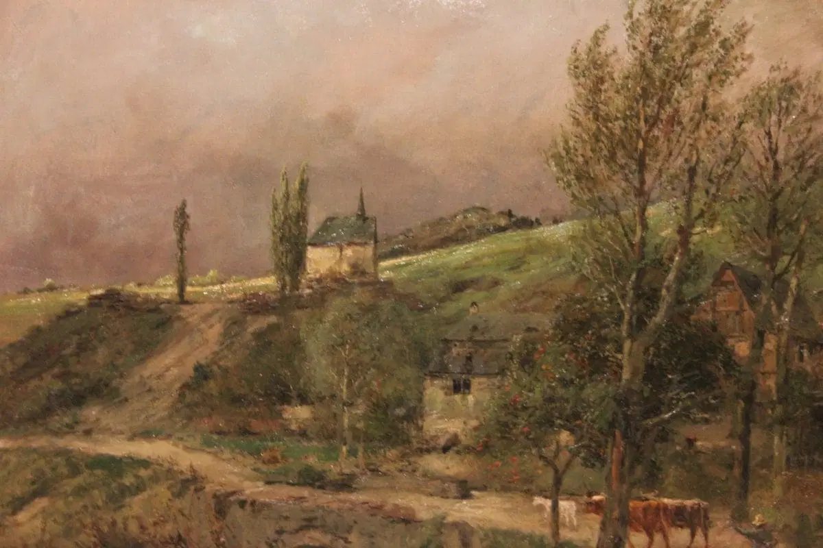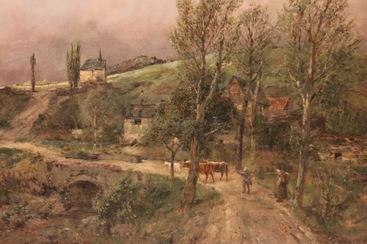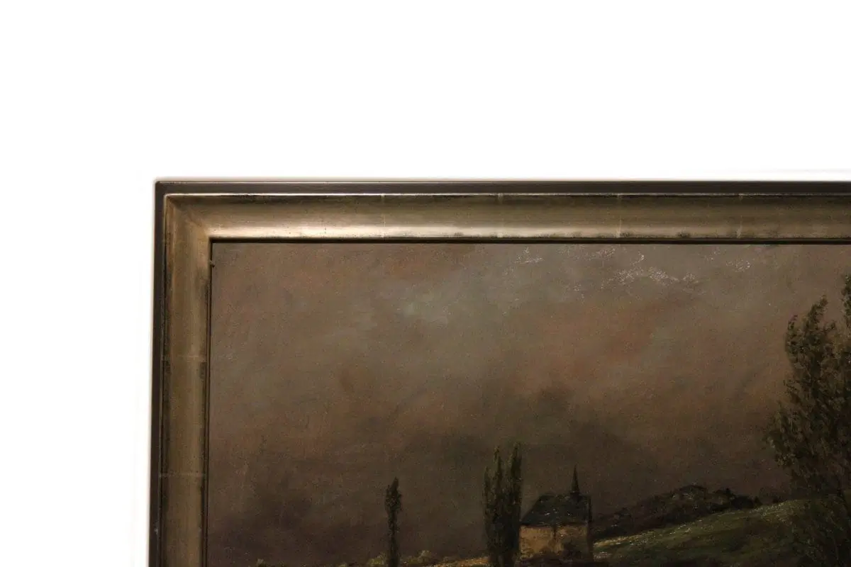Olio su tela olandese della prima metà 1800, raffigurante scena di vita campestre firmato Marinus Harting 1815 – 1861. Raffiguranti pastori e mandria di mucche su sentiero di campagna, con ponte in pietra, bosco ed abitazioni sullo sfondo.