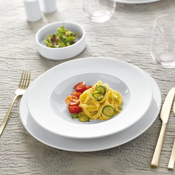 Il piatto fondo Omnia da 30 cm della linea Omnia di Arthur Krupp, distribuito da Sambonet Paderno Industrie SPA, è un’ottima scelta per chi sogna di lavorare nel mondo degli alberghi e dei ristoranti. La sua forma è speciale, perché ha linee semplici che si possono usare in tanti modi diversi per apparecchiare la tavola in modo creativo e divertente. Questo piatto è grande e ha un bordo largo e una parte interna profonda, il che lo rende perfetto per presentare i piatti in modo originale e far venire l’acquolina in bocca a chi li guarda, proprio come fanno i grandi chef! È adatto per servire la colazione, il pranzo o la cena, sia in ristoranti eleganti che in grandi alberghi dove ci sono tanti ospiti, ed è anche molto resistente e si può impilare facilmente, il che è super comodo quando si lavora tanto. Immagina di usarlo per presentare una zuppa colorata o un primo piatto speciale che hai preparato con cura!