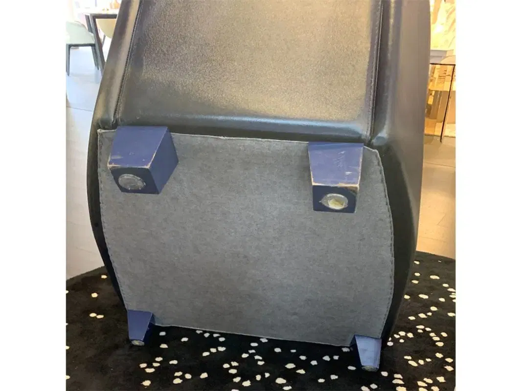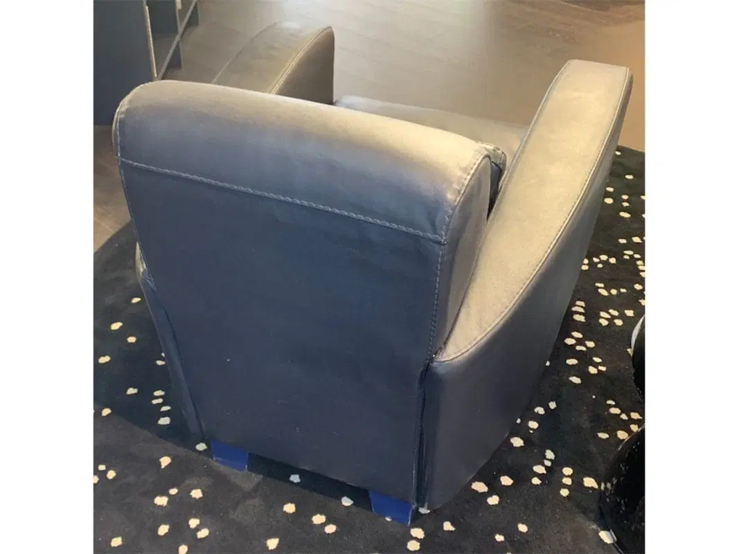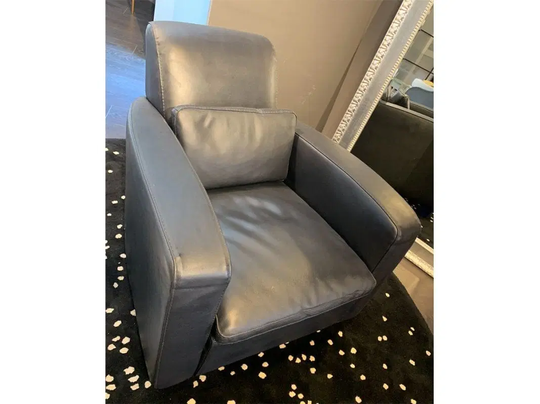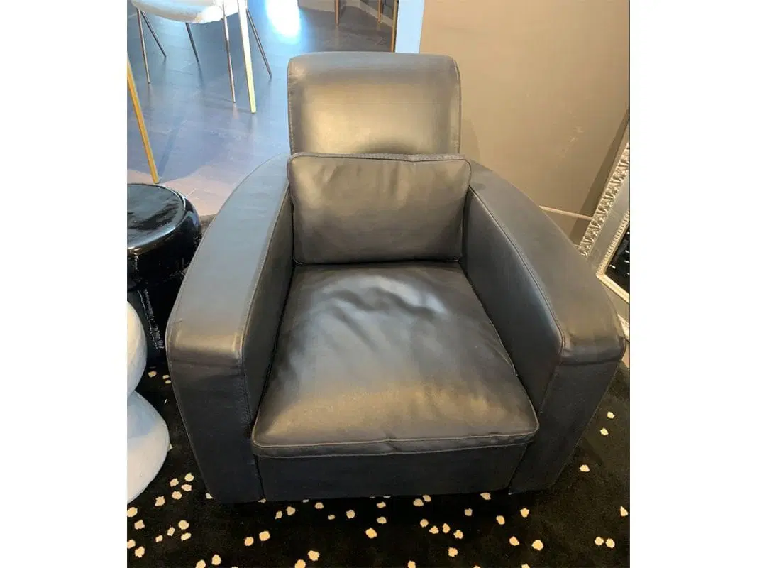 Poltrona relax interamente rivestita in pelle cerata con piedini in legno tinto blu. Perfetto complemento per un salotto spazioso e classico.