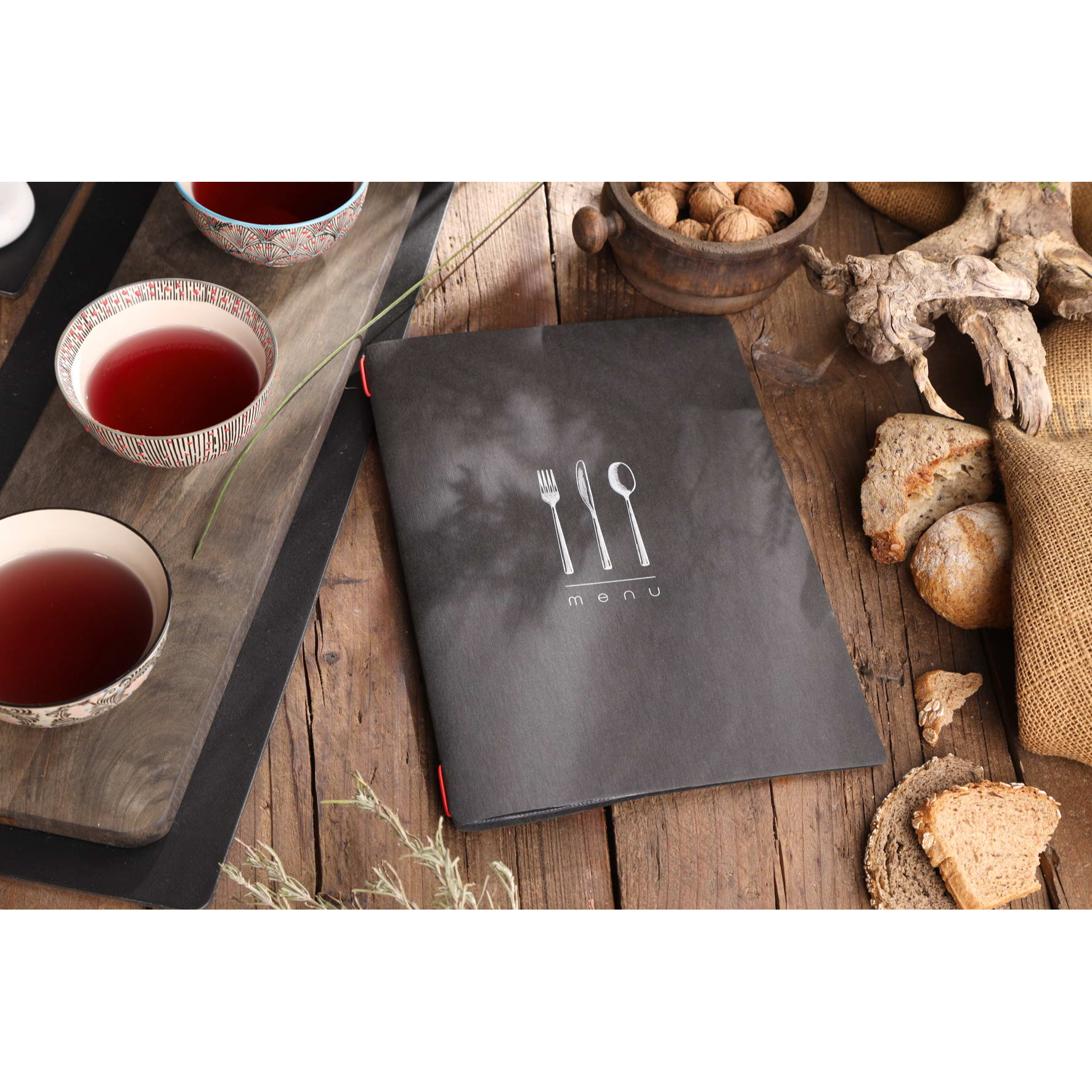 Personalizzazione omaggio sopra ai 18 pezzi! Premi “Sconti per grandi ordini! Clicca qui.” e compila il form per maggiori informazioni! Il portamenu Custom Nero Dinner A4 della linea CUSTOM di DAGSTYLE è una soluzione professionale ed ecologica per la presentazione dei menu nel settore alberghiero. Realizzato in fibra di cellulosa FSC lavabile, si caratterizza per una piacevole texture materica e uno spessore di 0,55 mm, offrendo una buona resistenza all’usura e un trattamento antimacchia certificato. L’elastico interno permette di inserire e organizzare buste, cornicette, fogli piegati o listelli bind acquistabili separatamente, garantendo una presentazione versatile e ordinata. La pulizia è semplice ed efficace con acqua e sapone sgrassante, e per le macchie più difficili si consiglia l’uso delicato di una spazzola morbida. Il design funzionale è specificamente studiato per le esigenze della ristorazione, e la sua produzione è interamente italiana. Per utilizzare il menù è necessario acquistare le buste di ricambio A4 opache (art. 107481) o trasparenti (art. 107480).