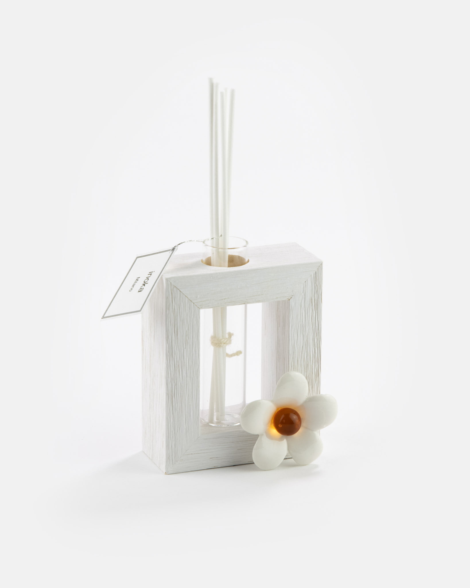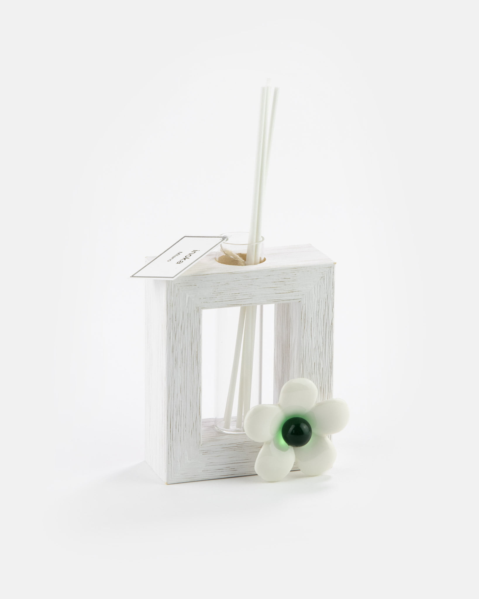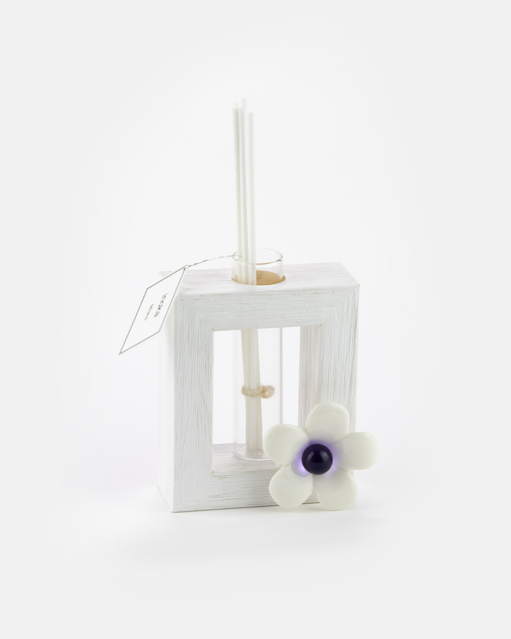 Profumatore fiore con cornice in legno e fiore con bocciolo in vetro che potrai scegliere tra tra i seguenti colori : blu-verde-lilla-fuxia-giallo.