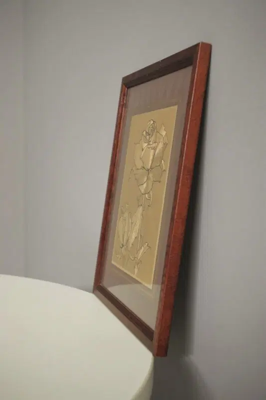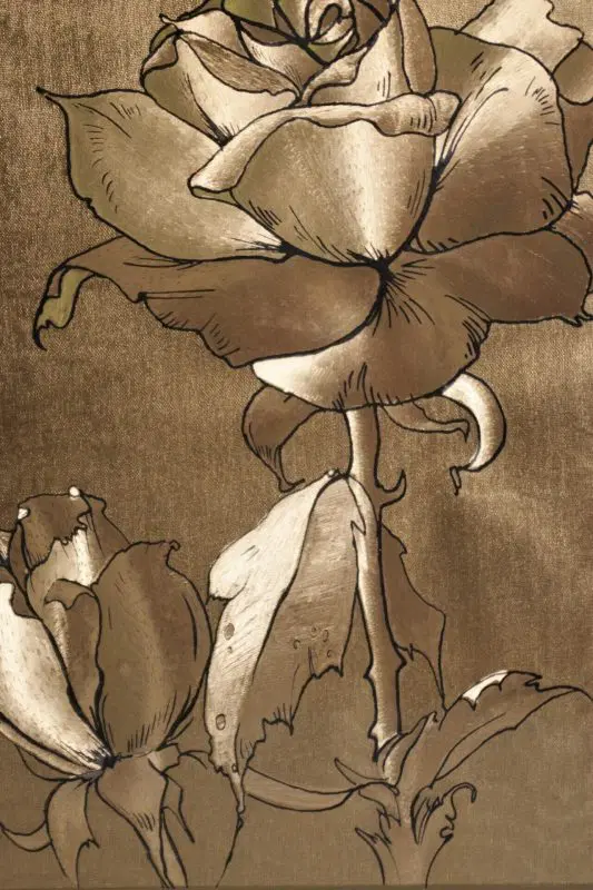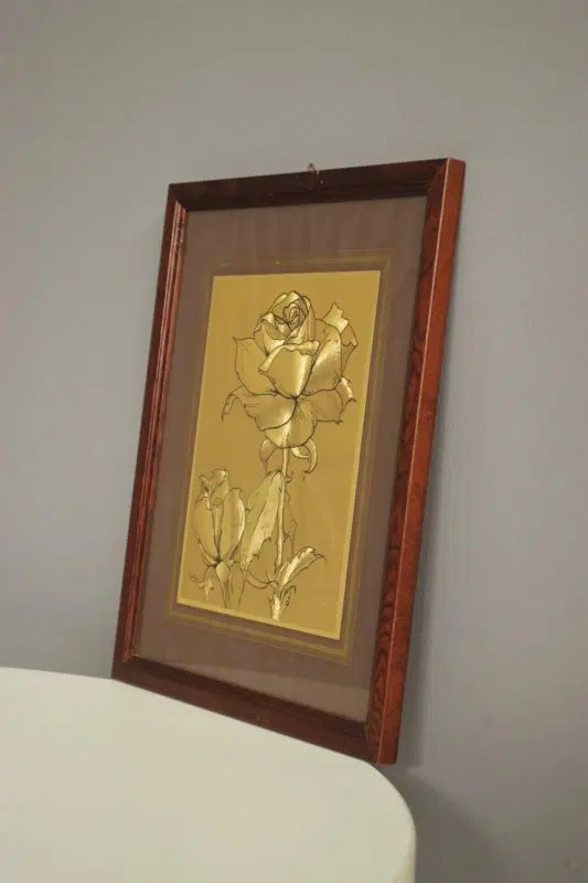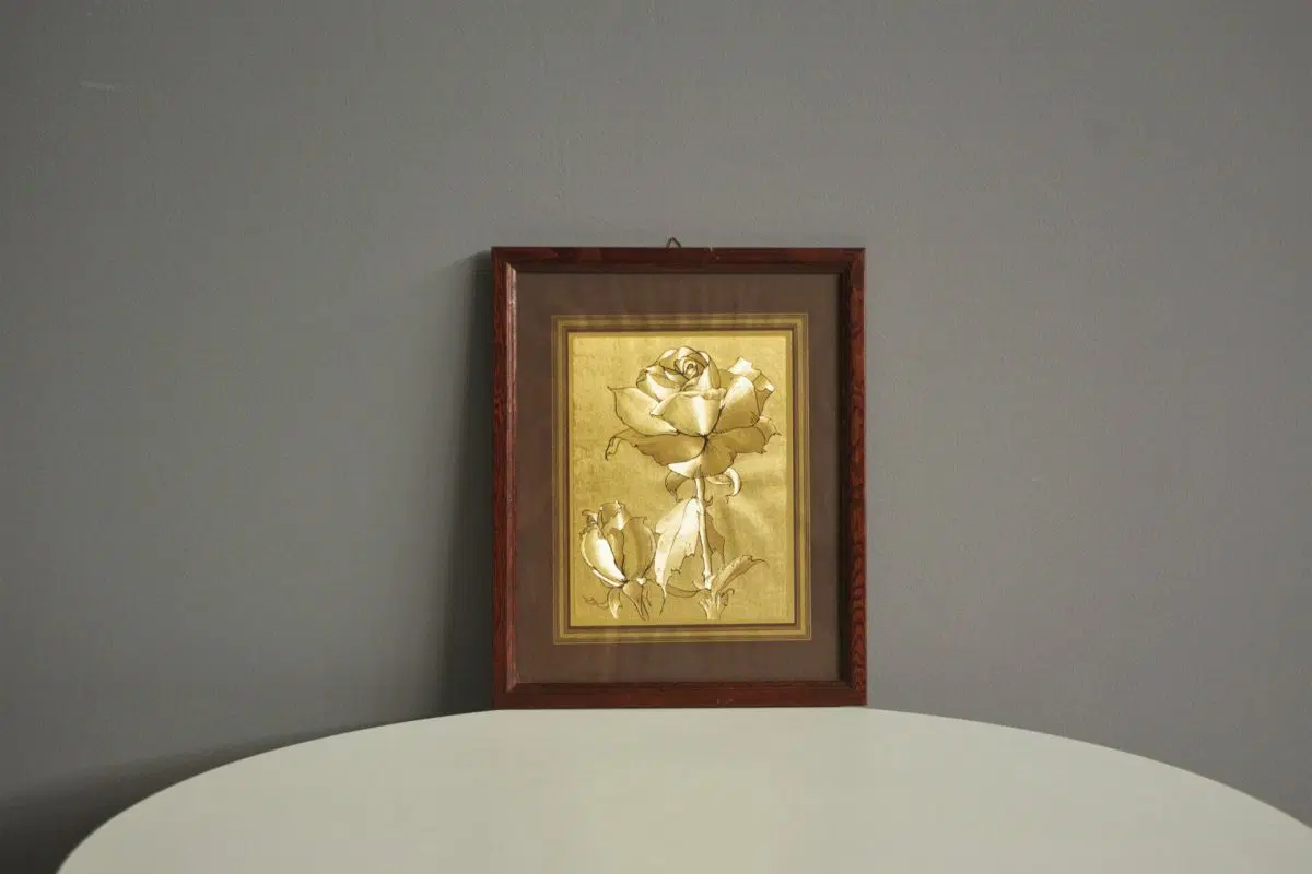 Quadro con rosa in oro e cornice in legno, anni ’70