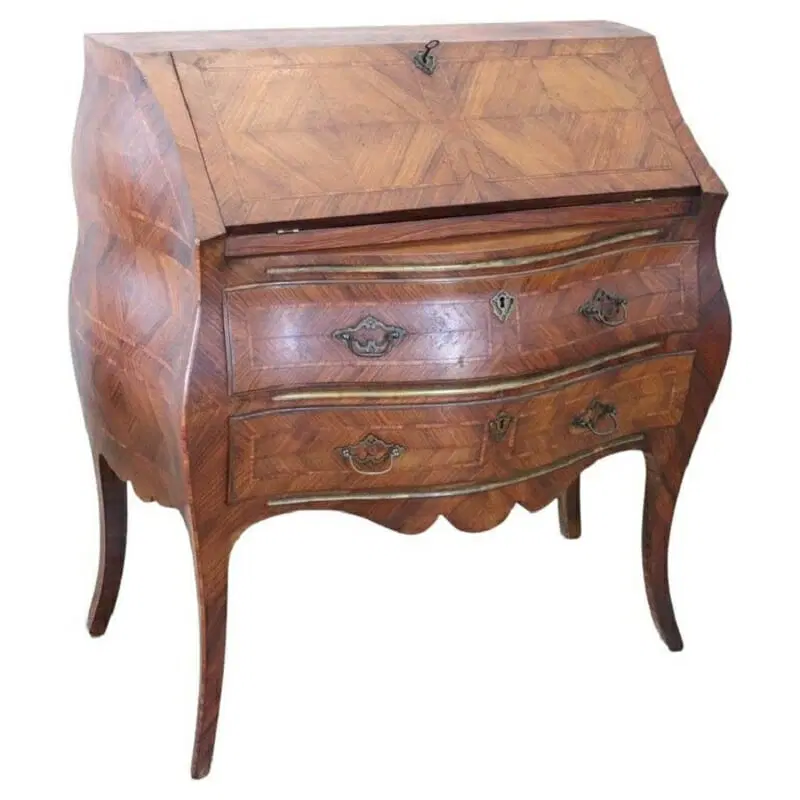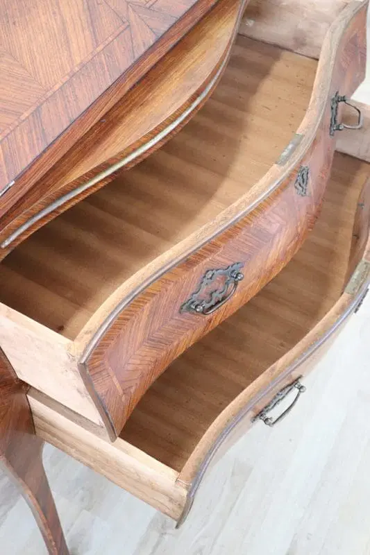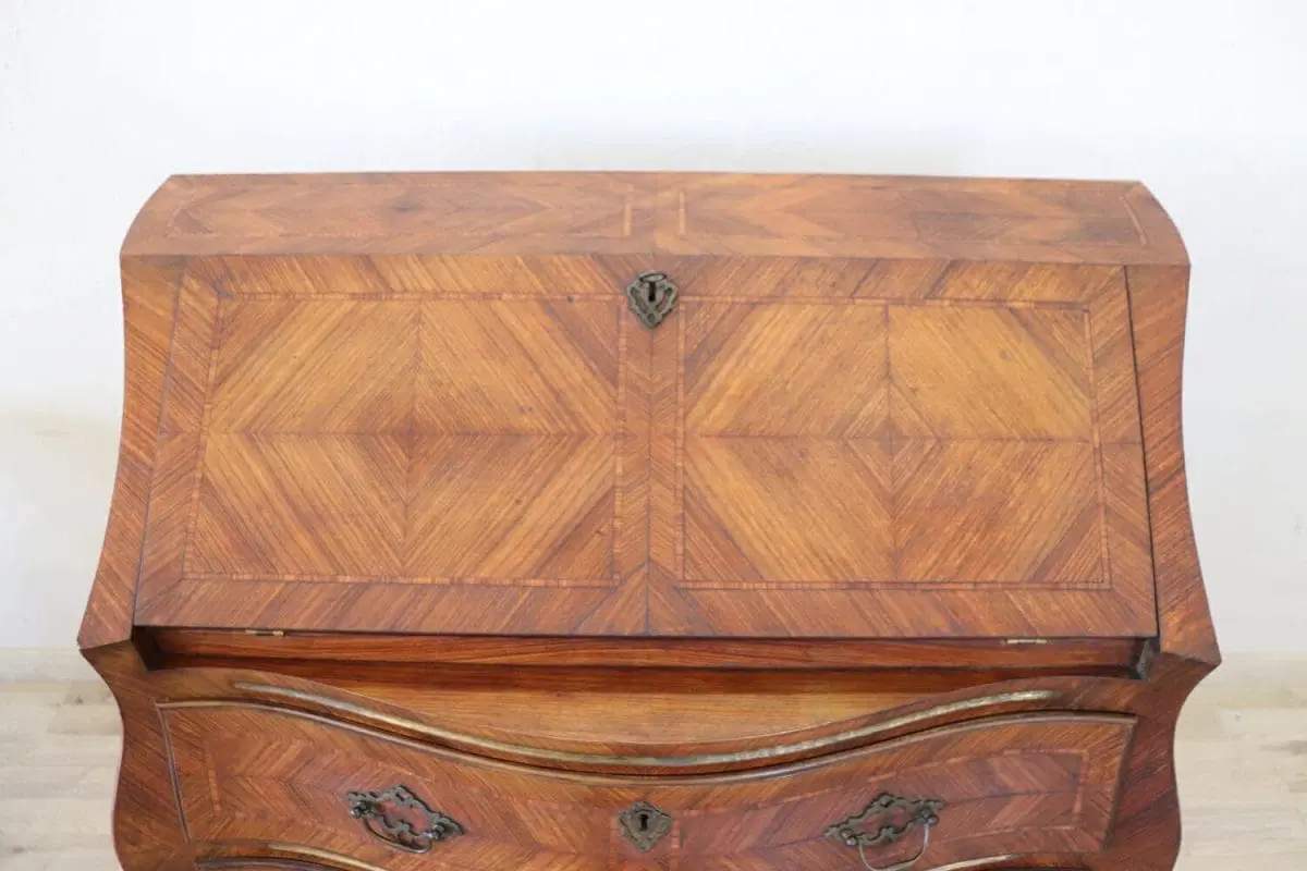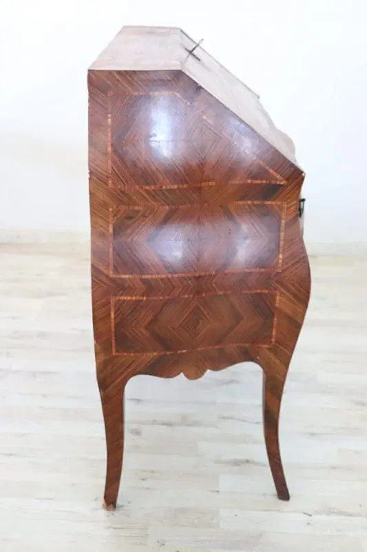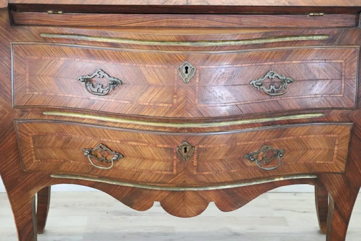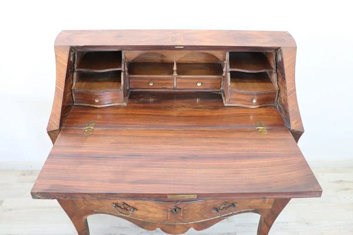 Elegante ribalta in stile antico Luigi XV primi decenni del secolo XX. Questo mobile è caratterizzato da una raffinata impiallacciatura in pregiato legno di palissandro. L’impiallacciatura è posata utilizzando le venature del legno come decorazione, i contrasti formano particolari decorazioni dal gusto geometrico su ogni lato del mobile. Di grande pregio la forma bombata con gambe ad encabriolè snelle e sinuose. Il piano apribile a ribalta diventa un pratico appoggio per scrivere. All’interno quattro piccoli cassetti. Due cassetti grandi e comodi sotto il piano a ribalta. Mobile in ottime condizioni pronto per essere collocato nella vostra casa. Vi consigliamo di guardare bene in dettaglio tutte le foto allegate. Proposto ad un’ottimo prezzo trattabile vi invitiamo ad inviarci le vostre proposte di acquisto le valuteremo con piacere.