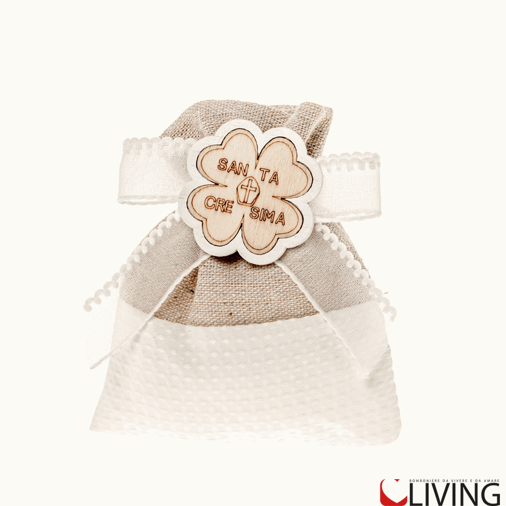 Il quadrifoglio in legno è inciso con la scritta “Santa Cresima”, rendendo questo sacchetto un ricordo unico e personalizzato per una giornata speciale. Il sacchetto è chiuso con un nastro in tessuto che aggiunge un tocco di eleganza e permette di conservare i confetti in modo sicuro.
