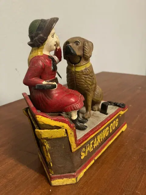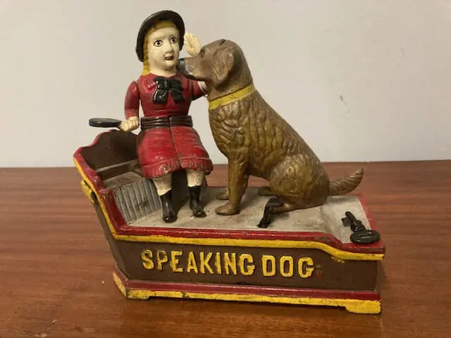 Antico particolare salvadanaio americano realizzato nei primi decenni del 900 , in ghisa dipinto , dotato di azione meccanica che permette di far cadere la moneta posizionata sul vassoio della ragazza all ‘interno del salvadanaio. In contemporanea scodinzola anche il cane con la coda. Vedi video completo nel ns instagram . Altri salvadanai analoghi disponibili provenienti da stessa collezione . vedi foto allegate