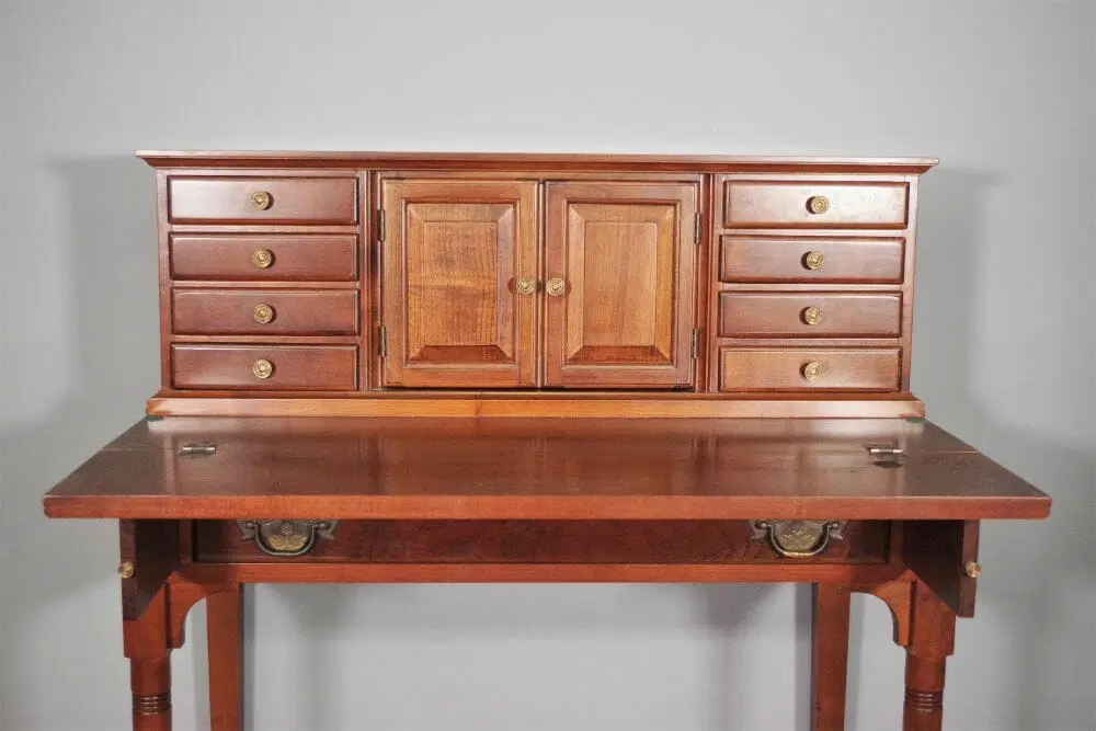 Scrittoio in legno di faggio con pomoli in ottone, ripiano a ribalta, anni ’70. L’oggetto vintage è completamente funzionante ma presenta segni di usura come graffi, ammaccature, difetti del materiale e riparazioni. Leggera usura dovuta all’età e all’utilizzo
