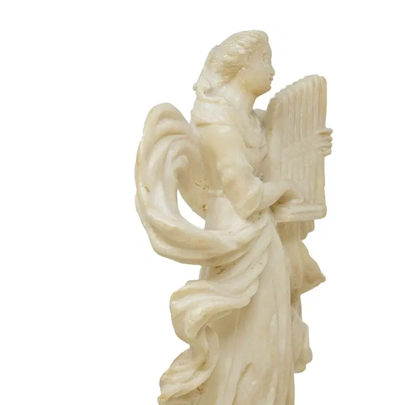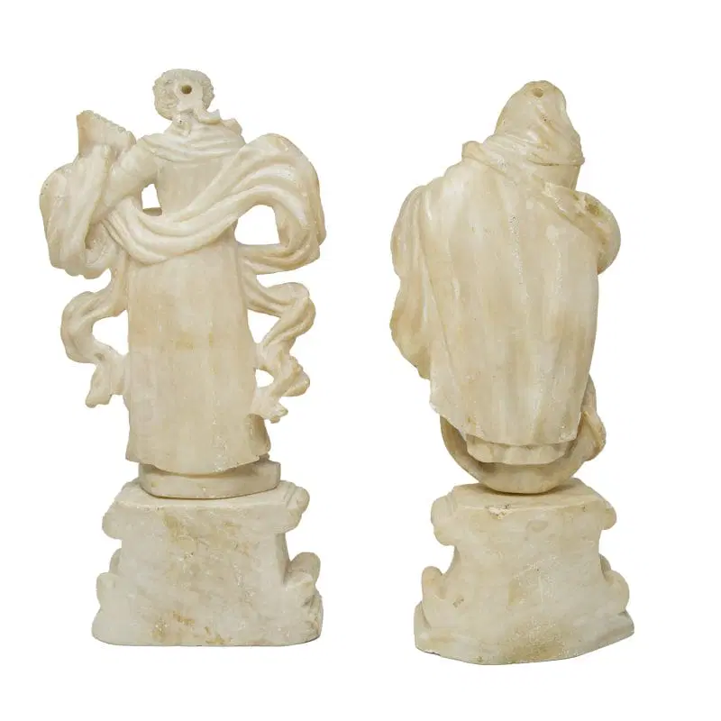 Le due statue in alabastro sono corredate da due basi architettoniche mistilinee sopra cui si trovano due sculture femminili raffigurati: Santa Cecilia e Santa Maria. La coppia appartiene alla produzione scultorea della Sicilia settecentesca, che nel campo delle arti decorative si appropria del linguaggio Rococò, allineandosi così agli stilemi internazionali. Nell’Isola, a partire dagli anni Quaranta del XVIII secolo, si assiste, all’innovazione dei moduli decorativi, ormai proiettati verso l’acquisizione dei modelli d’oltralpe, condizione che si manterrà per tutta la metà, e oltre, del secolo. Le opere assumono forme articolate, la materia sale dalla base e avvolgendosi a spirale si espande con morbide ondulazioni di superficie. Ma come avviene per ogni realtà di importazione, bisogna fare i conti con la radicata tradizione locale e questo scaturisce in una ibridazione di formule che si innestano al perdurare della sintassi seicentesca. L’incrocio tra il vecchio e il nuovo genera un originale linguaggio compositivo, definito barocchetto, fatto di memorie borrominiane e nuovi fregi, svolazzi e volute. Rinnovamento stilistico, questo, che in Sicilia investe tutte le arti, compresa la scultura di ogni materiale e dimensione; fra gli scultori di maggior fama si possono citare i membri della famiglia Serpotta, operanti anche a Roma e noti per le opere in stucco, Ignazio Marabitti (1719-1797) e Gioacchino Vitagliano (1669-1739). Tornando al soggetto, la Vergine segue l’iconografia dell’Immacolata, derivata dalla descrizione fatta nell’Apocalisse di Giovanni: la donna che calpesta il serpente alluderebbe proprio alla Madonna che vince sul male, ovvero il serpente, mentre la mezzaluna simboleggerebbe la sua purezza, forse mutuata da alcune dee dell’antichità, raffigurate con il crescente lunare. Dall’altro lato troviamo Santa Cecilia, nobile romana convertita al cristianesimo nel corso del III d.C. e considerata patrona della musica; per questo motivo è spesso raffigurata con strumenti musicali, l’organo in questo caso, o spartiti musicali. Entrambe appaiono in movimento grazie al panneggio dinamico e turbinoso delle vesti che si attorcigliano attorno alle figure slanciate e dalle linee sinuose.