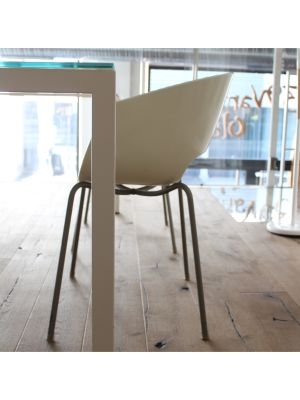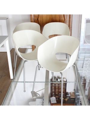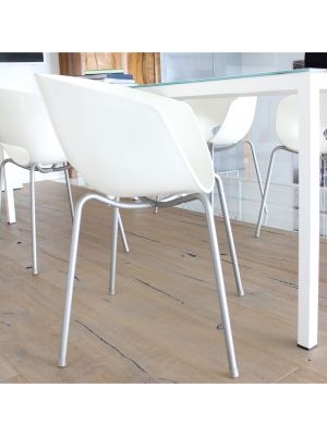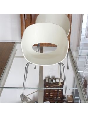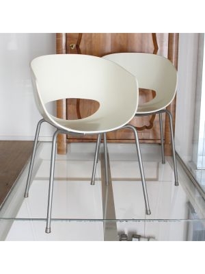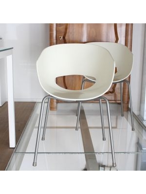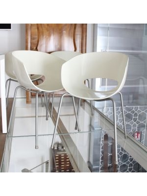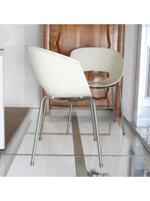 Realizzate con una combinazione di plastica e resina modellata per garantire comfort e resistenza, le sedute sono sostenute da una struttura in acciaio cromato che riflette la luce con una discreta eleganza futurista. Ogni curva, ogni materiale è scelto con la precisione tipica del Made in Italy, trasformando un oggetto quotidiano in unicona di stile.