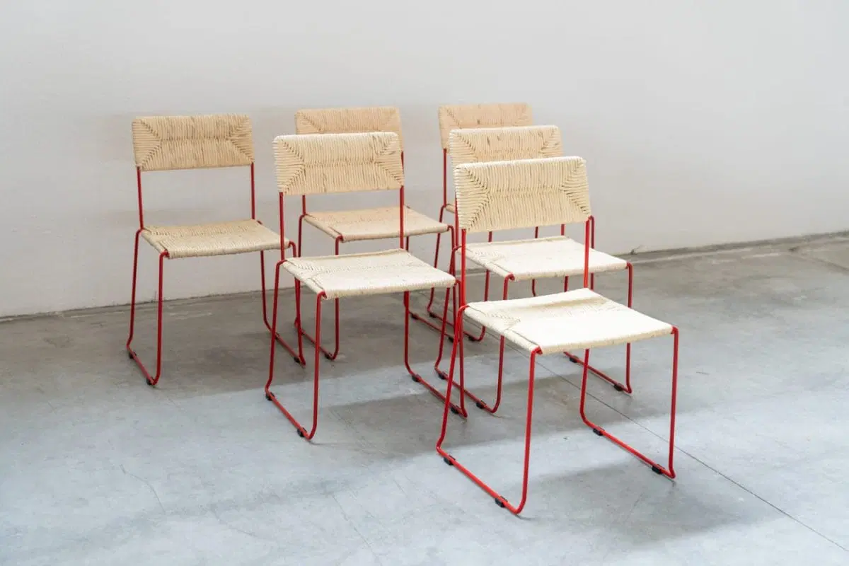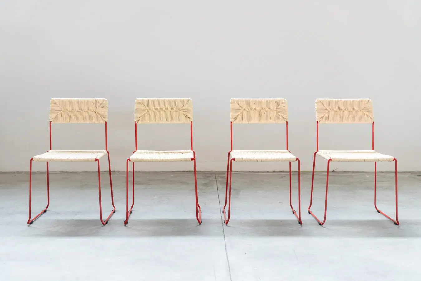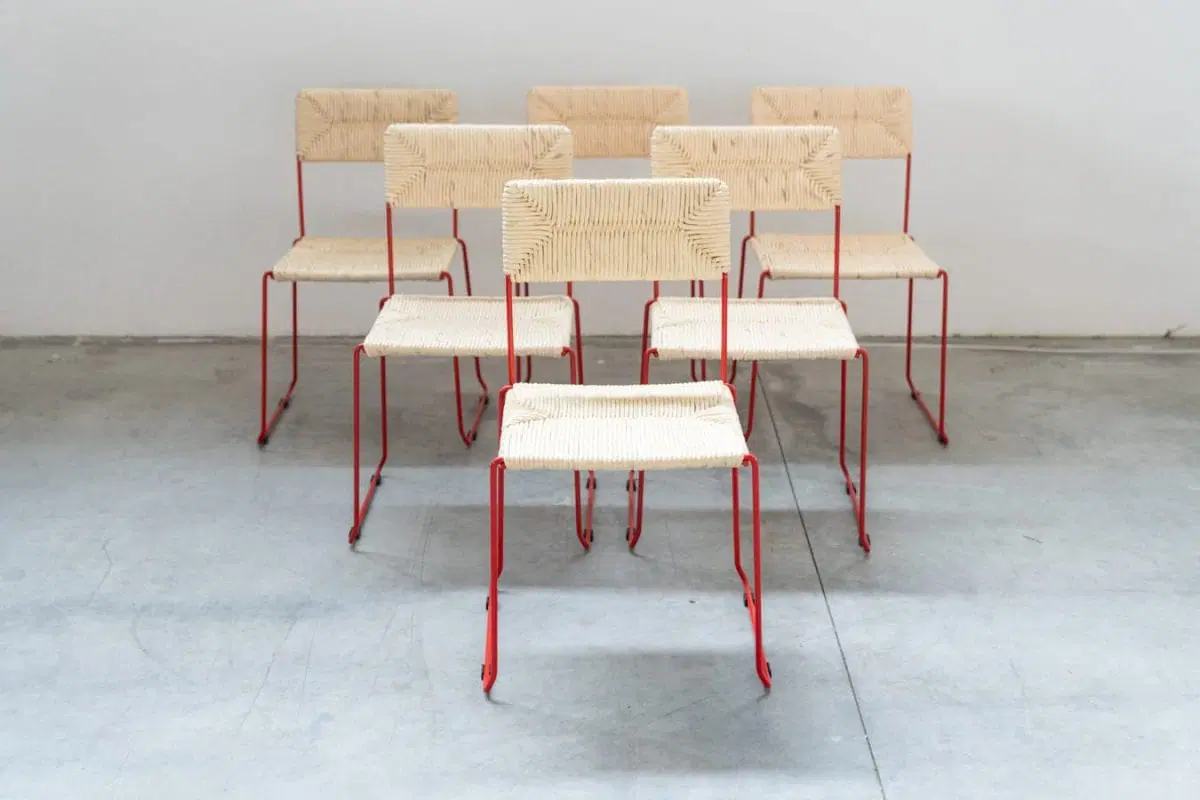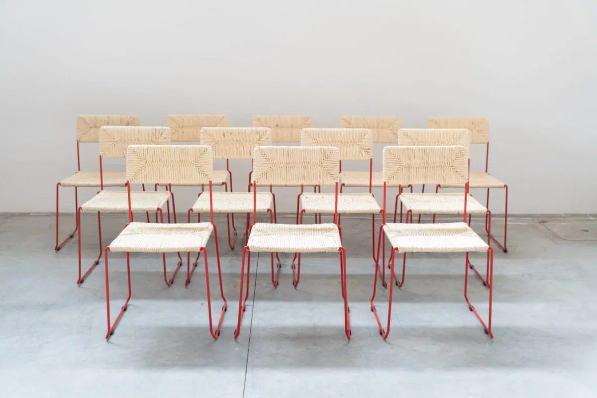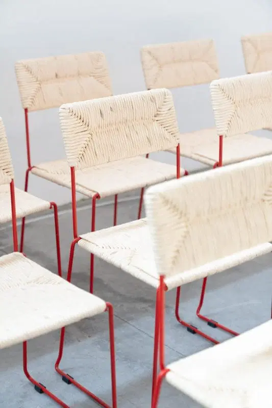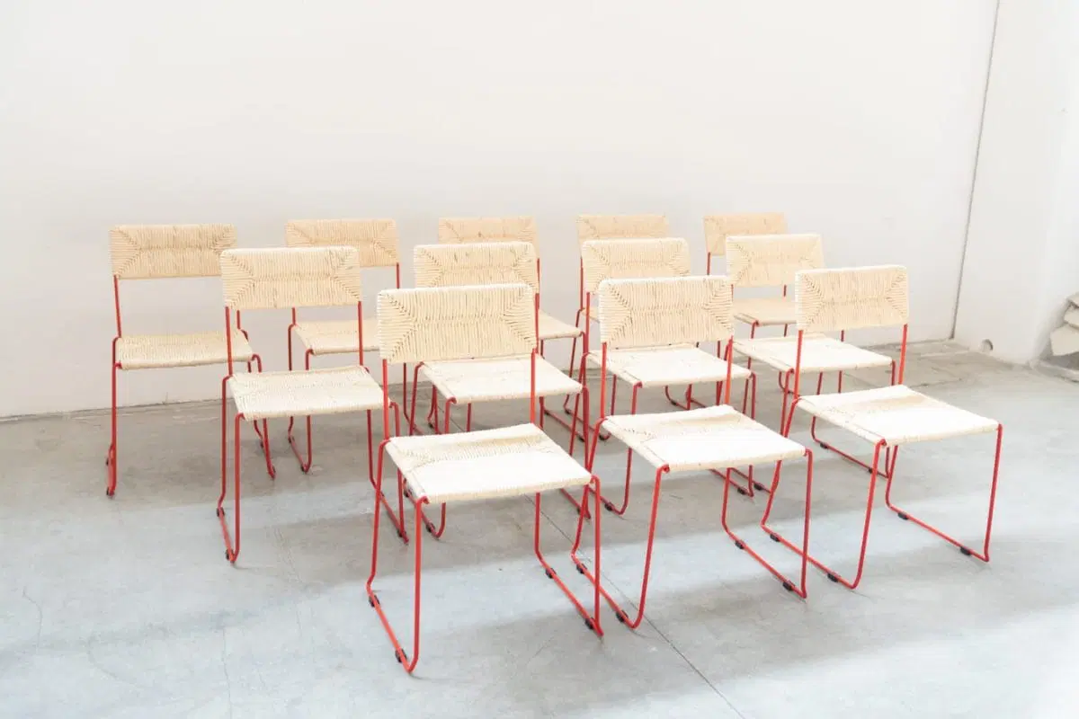 Sedie NUOVE, ancora inscatolate, in ferro curvato verniciato di rosso. Il sedile e lo schienale sono impagliati a mano sulla struttura (paglia di carta), per garantirne la loro grande resistenza. Possono essere impilate fino ad un numero di 8 sedie. Disponibili fino a nr 160 sedie, vendibili anche singolarmente. Stile di PIRELA ATELER, prodotte nel 2000/2010 dall’azienda SINTESI, made in Italy. Costo cad. €366.00 cad.