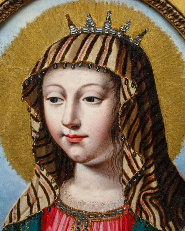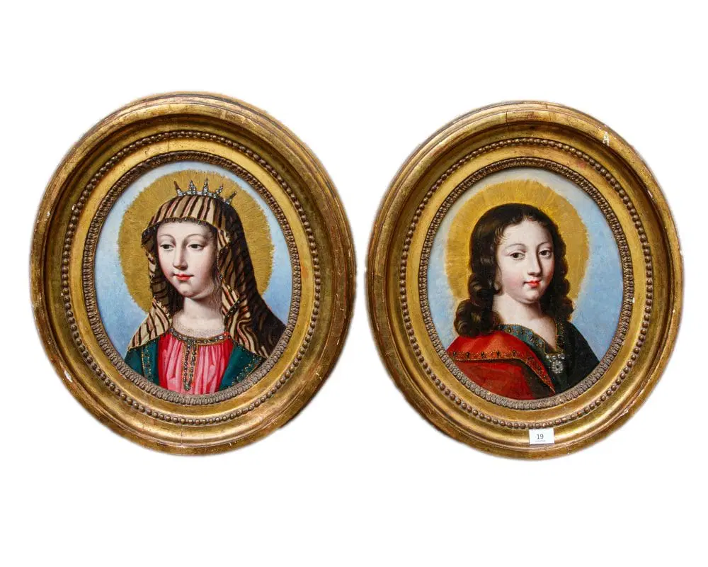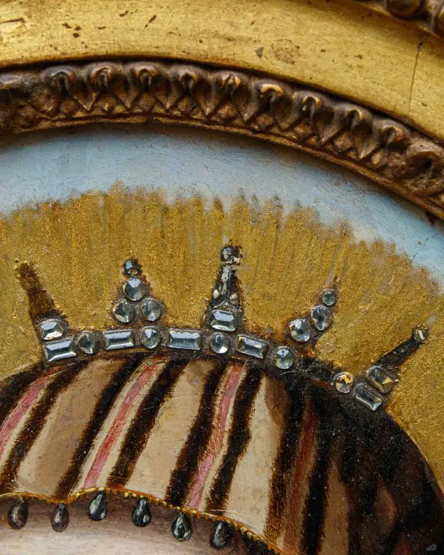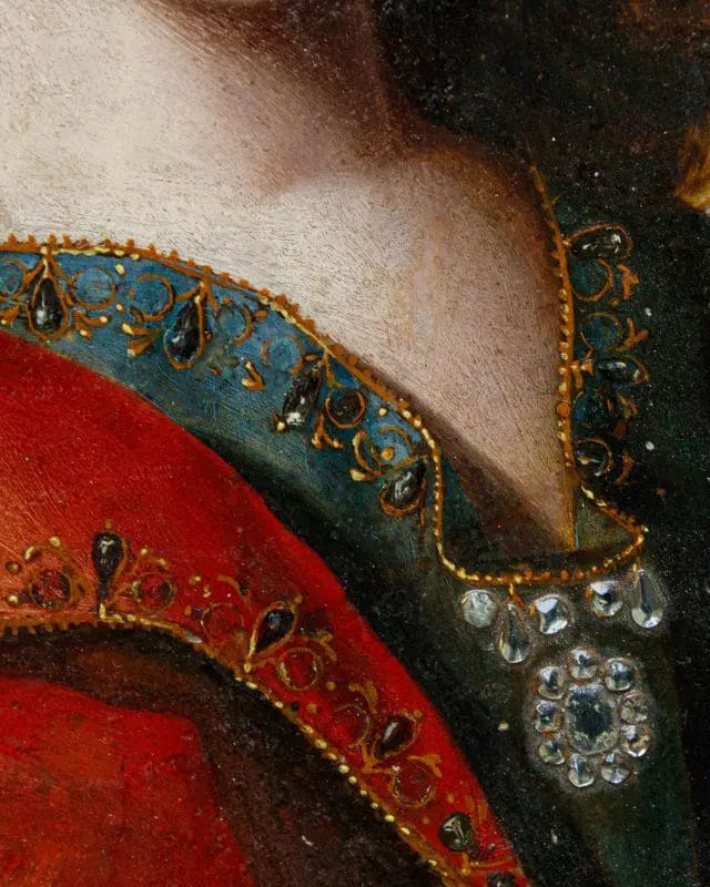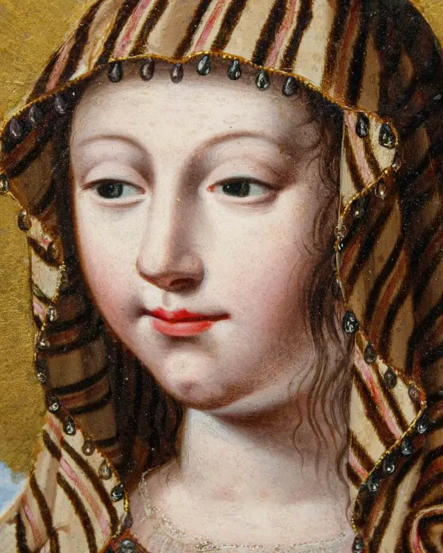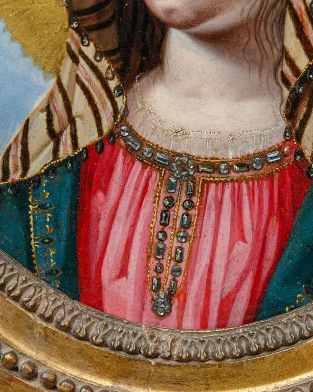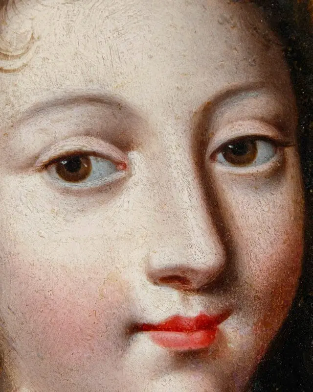 Nella produzione ritrattistica di Jean Ducayer e Jean Leblond, questa coppia si distingue per il suo soggetto religioso della Vergine e del Cristo Bambino. I modelli delle due figure si potrebbero identificare con Anna d’Austria e il bambino Luigi XIV, in linea con la propaganda della famiglia reale al tempo delle proteste contro la monarchia assoluta. Infatti, dopo la morte di Luigi XII nel 1643, la moglie Anna diverrà reggente per il figlio Luigi XIV fino al 1651, affrontando nel mentre la rivolta della Fronda parlamentare (1648-1649). In alcune incisioni e dipinti del periodo, la coppia formata da Anna d’Austria e Luigi XIV è vista come una controparte della Vergine e del Bambino Gesù, con la regina reggente, in lutto, che desidera essere associata alla più perfetta delle madri: la Vergine Maria. L’inseparabilità della coppia, nonostante siano divisi in due cornici diverse, va ricondotta al genere, molto diffuso in Francia durante la reggenza di Anna d’Austria, dei regards, ossia degli “sguardi”. Il fervore cattolico della regina, che aveva chiamato il figlio Luigi dono di Dio, aiuta nel comprendere i motivi di questa scelta iconografica nel panorama francese della prima metà del Seicento, periodo in cui è attivo come ritrattista Jean Ducayer, artista alla cui scuola sono attribuiti i due piccoli marmi. La serie di ritratti realizzati dall’artista è in linea con la posa, i costumi e la resa dei lineamenti del viso che ritroviamo qui, vicini al filone di opere identificabili con gli state portraits. Lo sforzo appare quindi teso a rendere ben evidente lo status politico e sociale dell’effigiato. Ci si concentra sui più evidenti attributi del potere e della ricchezza mentre il modello viene raffigurato, con sembianze assorte e impenetrabili, quasi a sottolinearne l’impersonale immutabilità e impermeabilità al corso degli eventi. Il successo di questo genere nel corso del Seicento si esplicita nella lunga serie di ritratti di sovrani, nobili e cortigiani europei di cui si producevano più versioni, spesso da parte dei seguaci o degli allievi degli artisti come in questo caso. I volti dei due sovrani francesi, trasferiti in ambito religioso, sono arricchiti da pietre dure preziose come i sassi di Reno, ovvero cristalli vitrei intagliati e incisi artigianalmente per aumentarne la brillantezza, posti nella corona e nel ciondolo, che risaltano sulla superficie liscia del marmo, tagliato a forma ottagona e inserito in due cornici ovali in rovere, stampate e dorate, di periodo Luigi XVI.