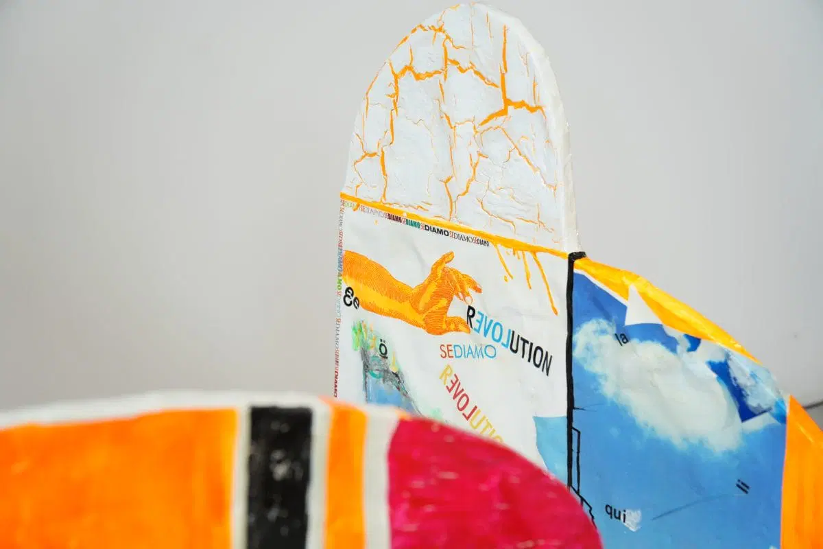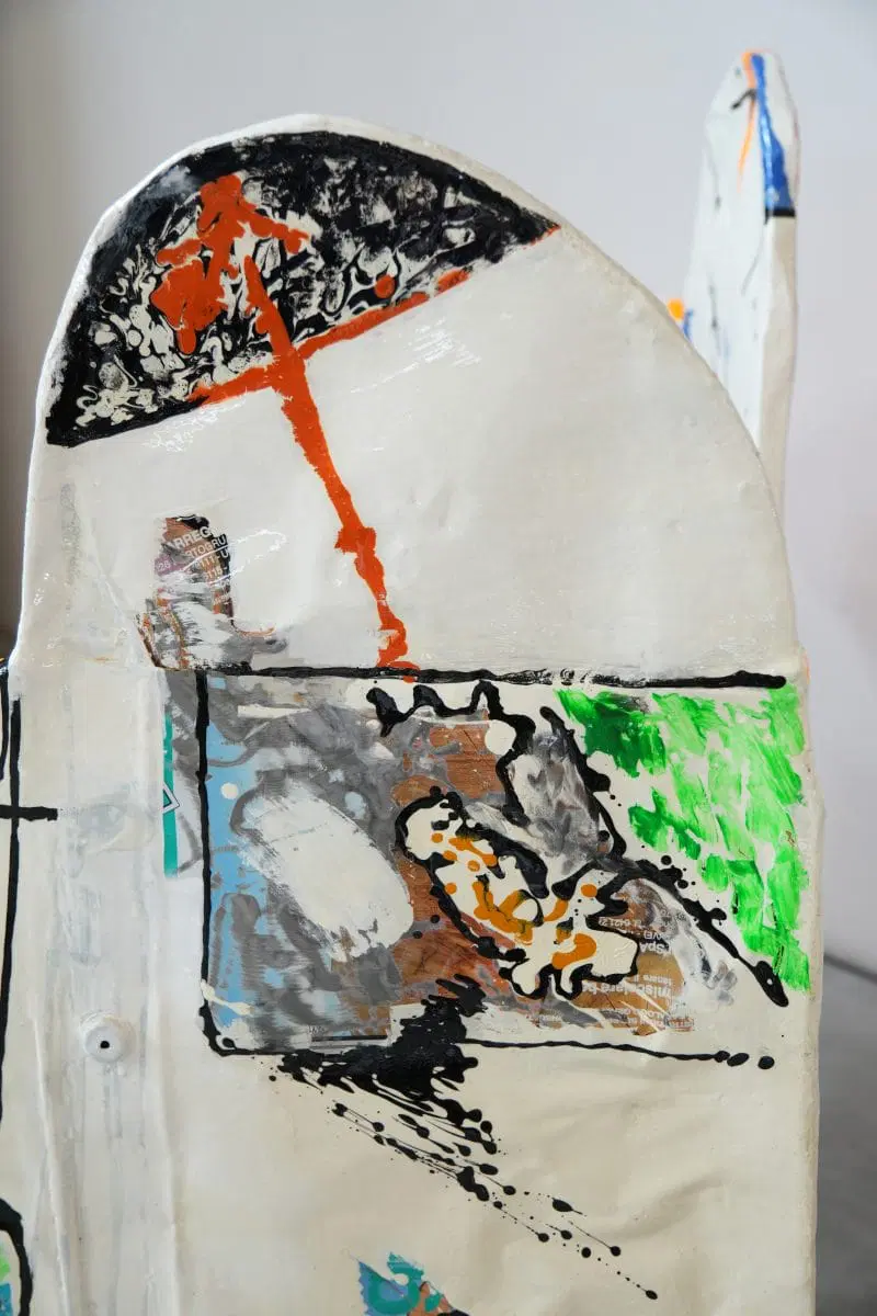 Each chair is a unique piece, decorated with vivid collage work made from salvaged materials, layered paint, and reclaimed images. The aesthetic is distinctly Pop Art, with vibrant tones and graphic elements that evoke a hand-made take on Rauschenberg’s “combine” technique.