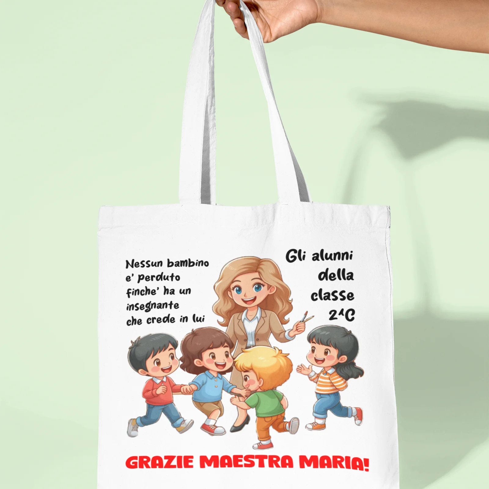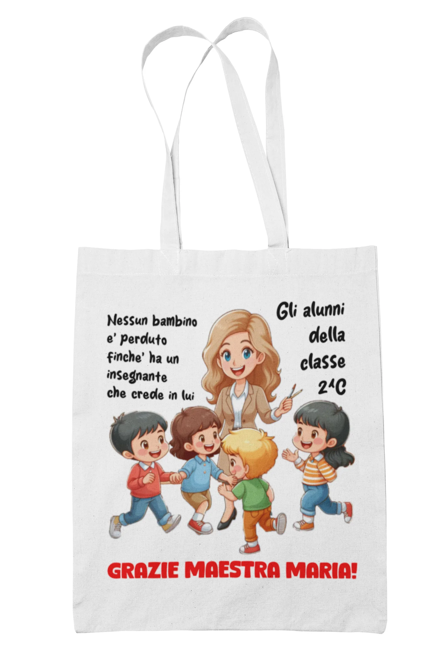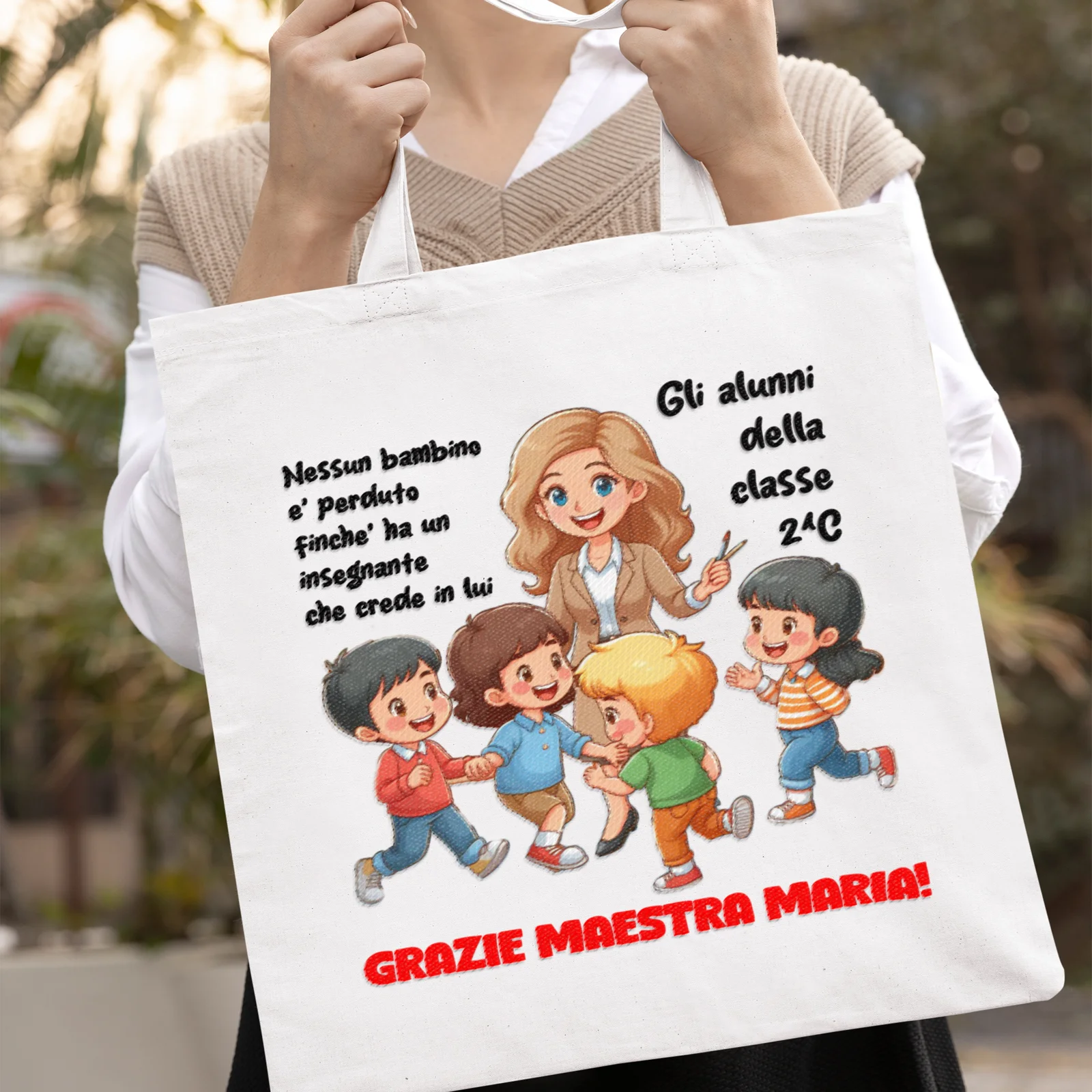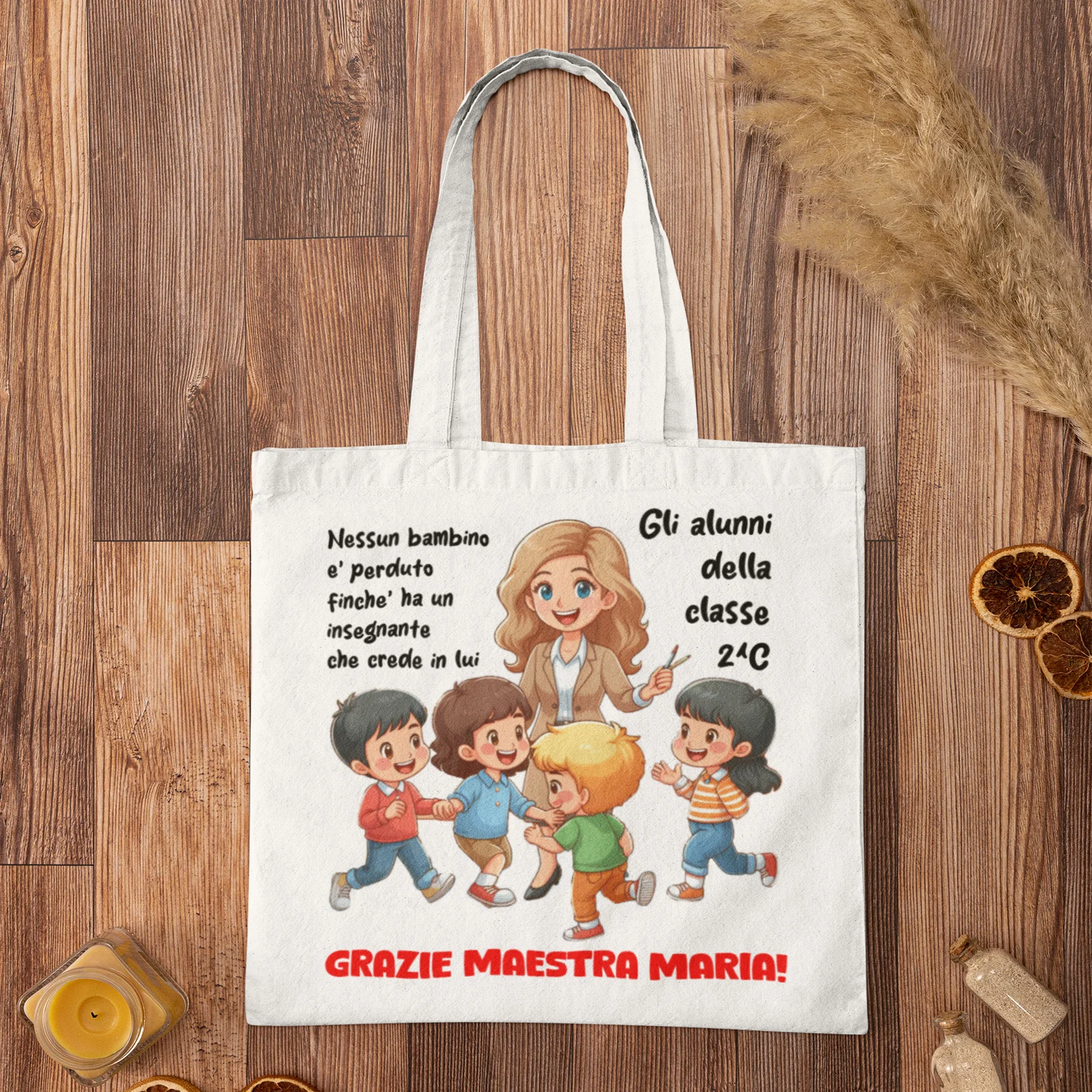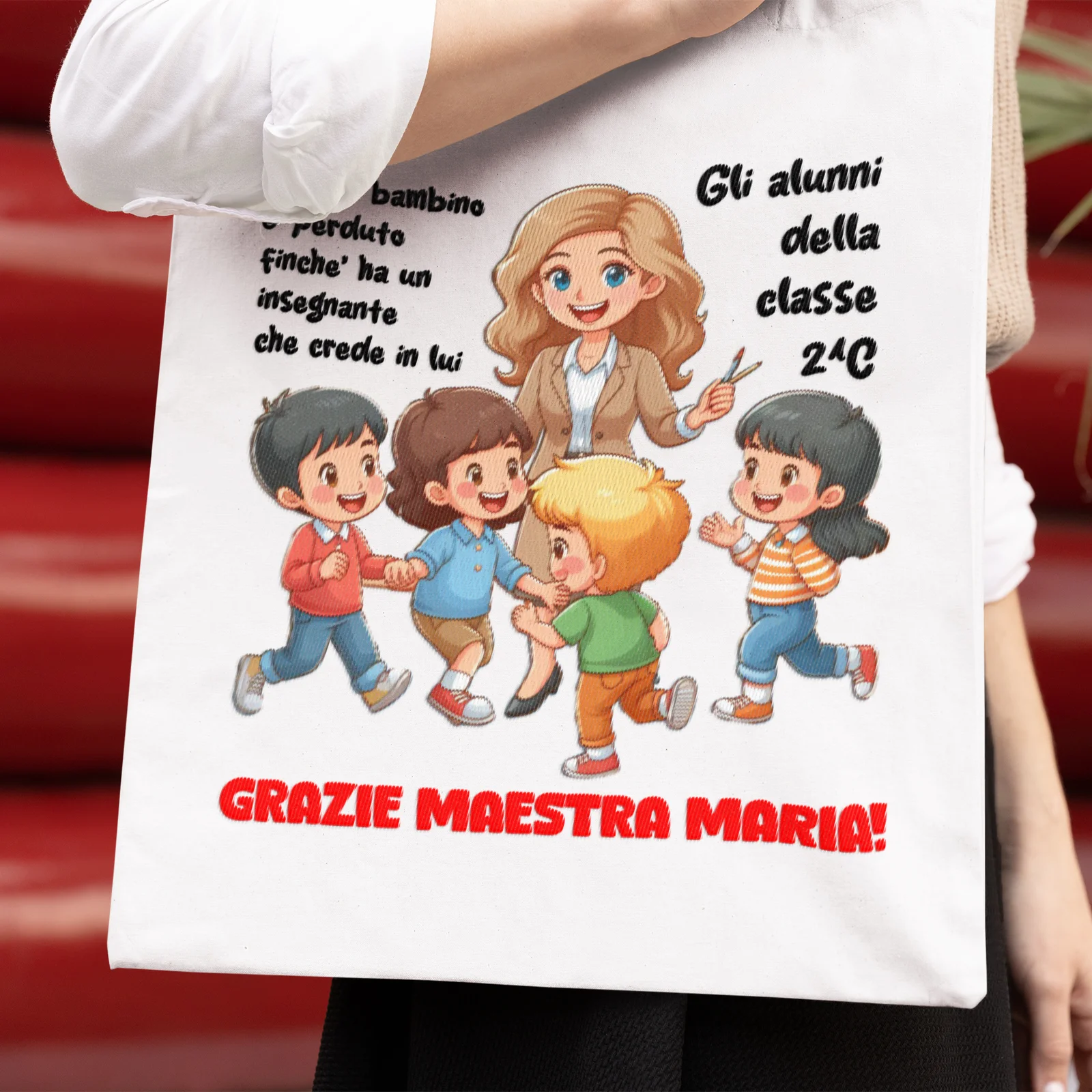 IDEA REGALO FINE ANNO SCOLASTICO: Scegli tra le tante grafiche a disposizione per festeggiare la tua maestra con questa divertente shopping bag in cotone idea regalo adatto per la fine dell’anno.