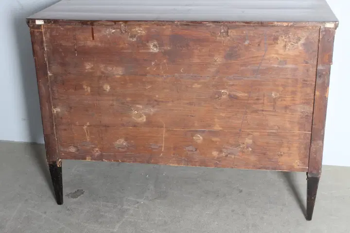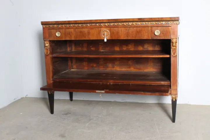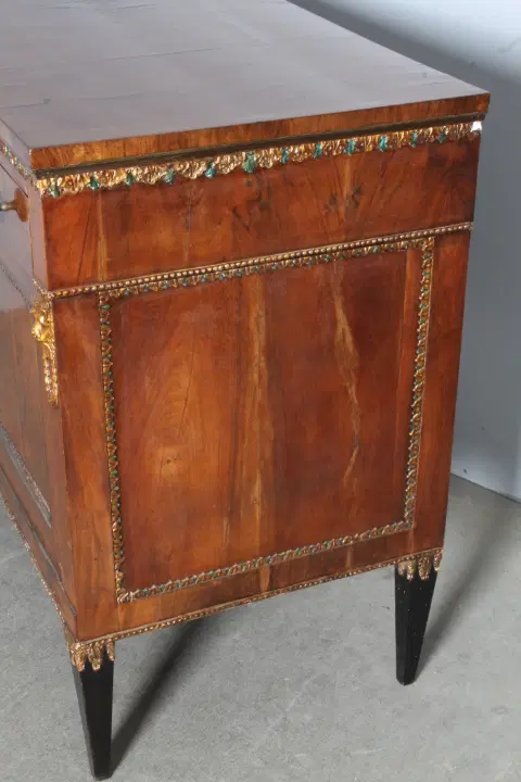 Antica splendida e rara credenza Impero 1830, realizzata in noce , con bronzi sui montanti , piedi tronco piramidali a lacca dipinti nero . Cornice sotto il piano con profili dipinti a foglie verdi e oro riprese sul fronte , sui fianchi e sui piedi . Cassetto superiore e anta a ribalta. noce Umbria. Mis 129 x 57 Altezza cm 93 .Buono lo stato generale , necessita ripresa della lucidatura.