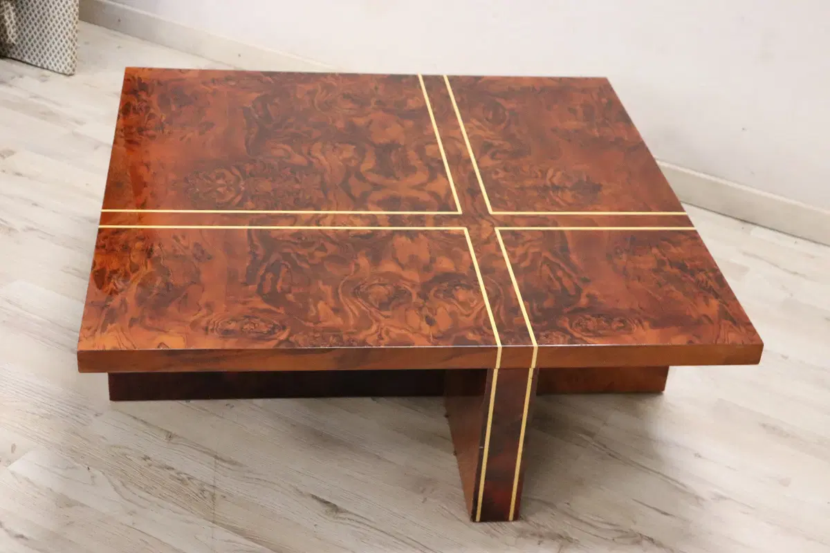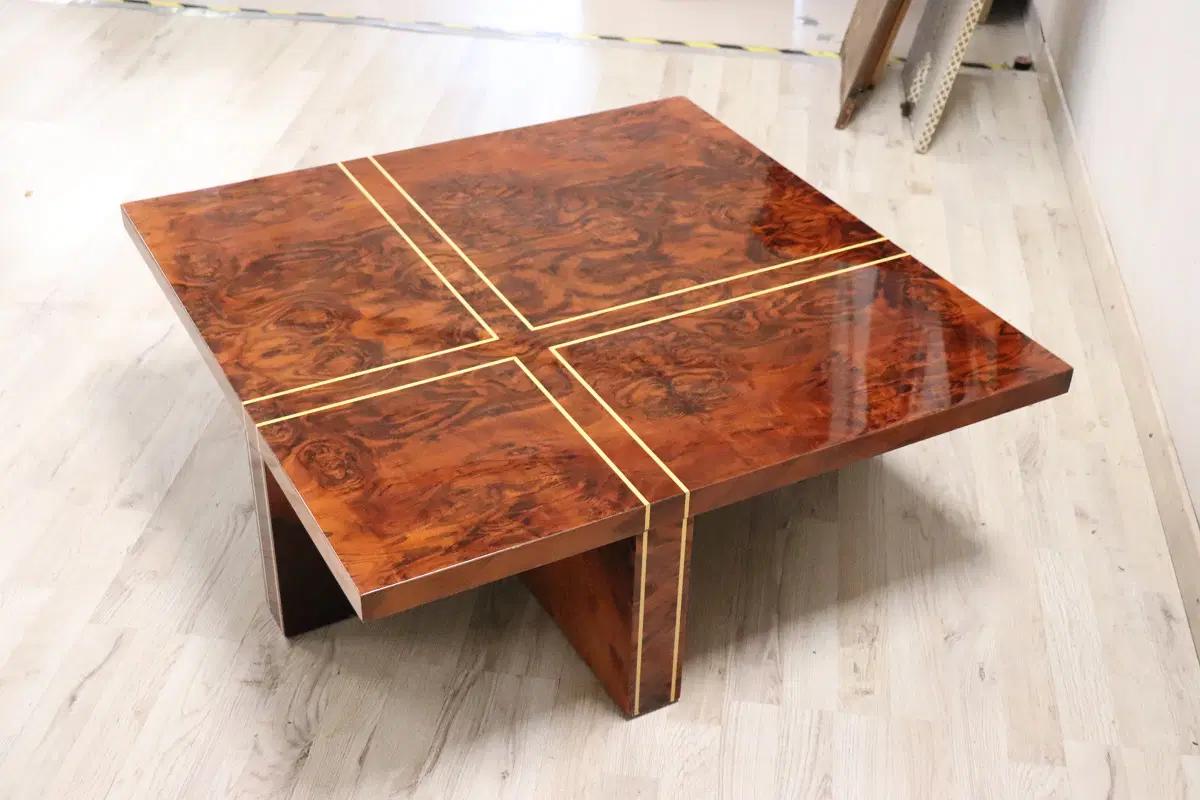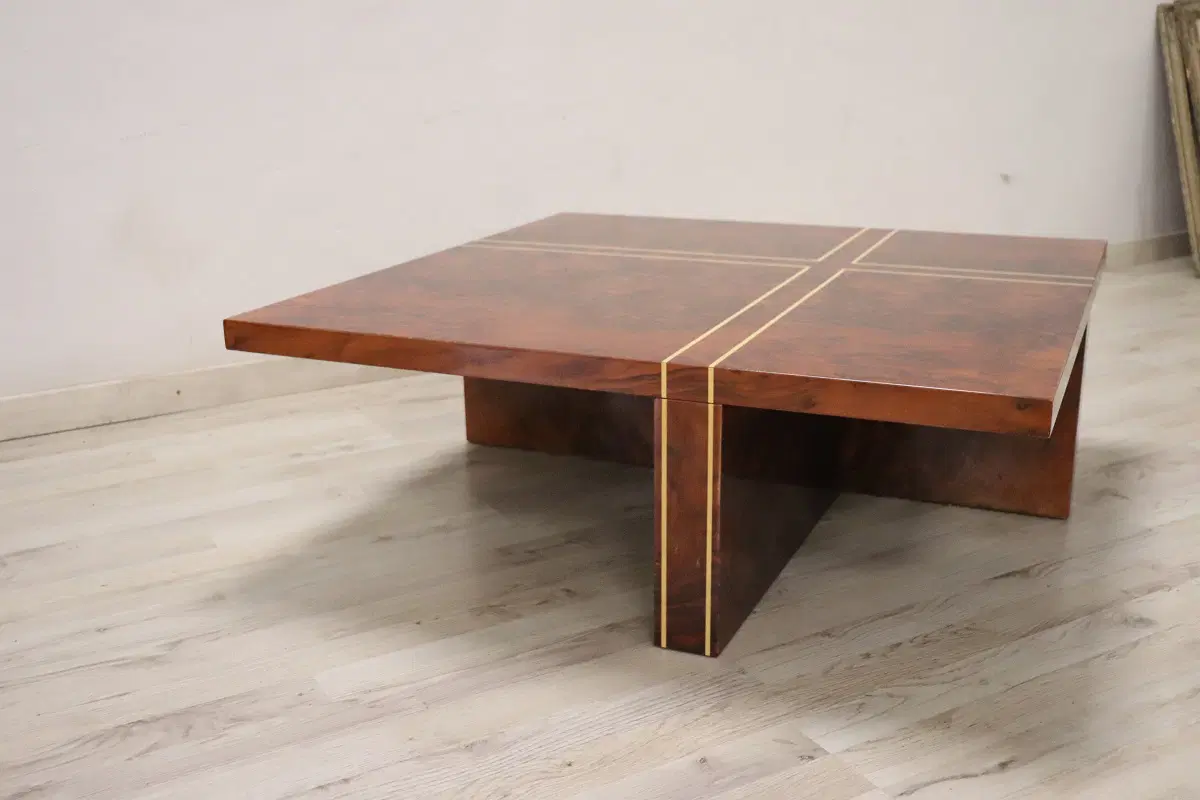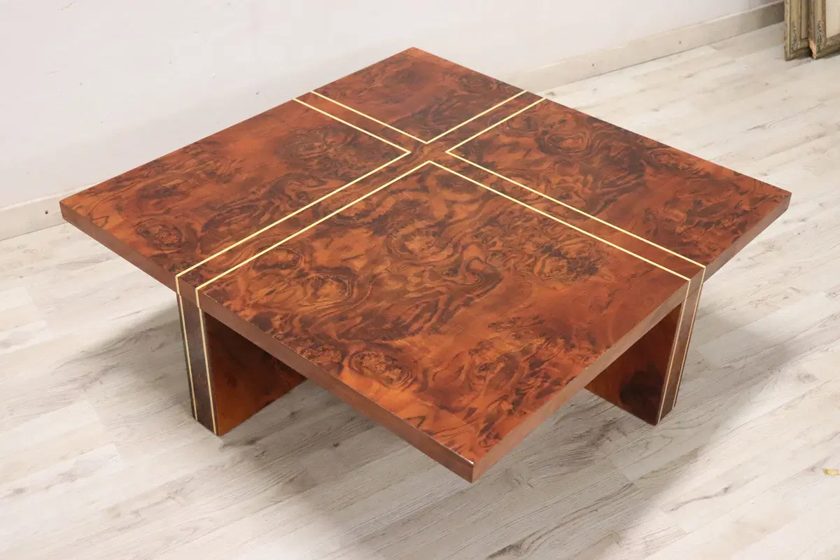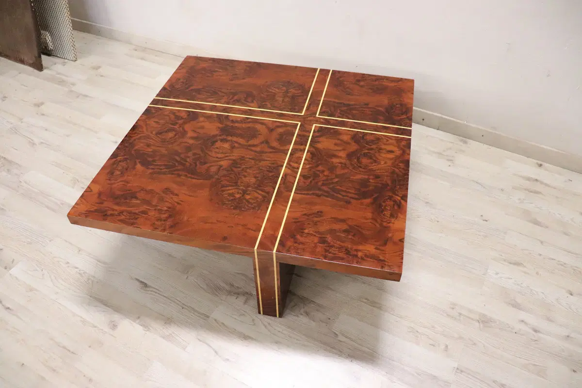 Un tavolino che unisce eleganza e funzionalità in un modo senza tempo. Realizzato con impiallacciatura di radica di noce e abbellito da intarsi geometrici in legno chiaro, questo tavolino non è solo un complemento d’arredo, ma un vero e proprio oggetto d’arte. La sua forma raffinata e il design ispirato alla geometria razionalista lo rendono perfetto per arricchire qualsiasi ambiente contemporaneo, donando un tocco di classe e originalità. In eccellenti condizioni vintage, presenta solo lievi segni di usura sul piano, quasi impercettibili e visibili solo a un’attenta osservazione o in condizioni di luce diretta. Questi dettagli non fanno altro che testimoniare la sua storia e il suo carattere unico. Questo tavolino diventerà indubbiamente il punto focale del vostro salotto, esprimendo l’alta qualità artigianale e l’innovazione del design italiano di quel periodo. Non lasciatevi sfuggire l’opportunità di arricchire il vostro spazio con questo straordinario pezzo di arredamento!