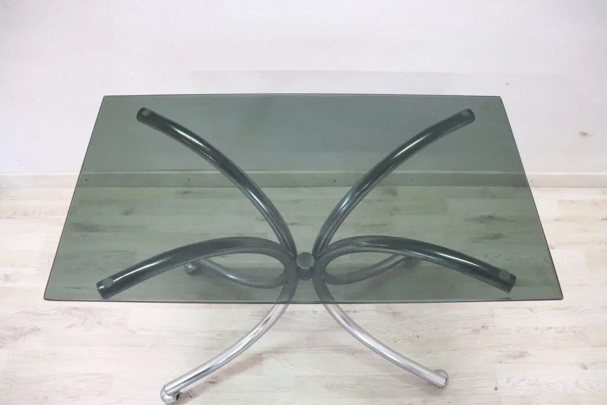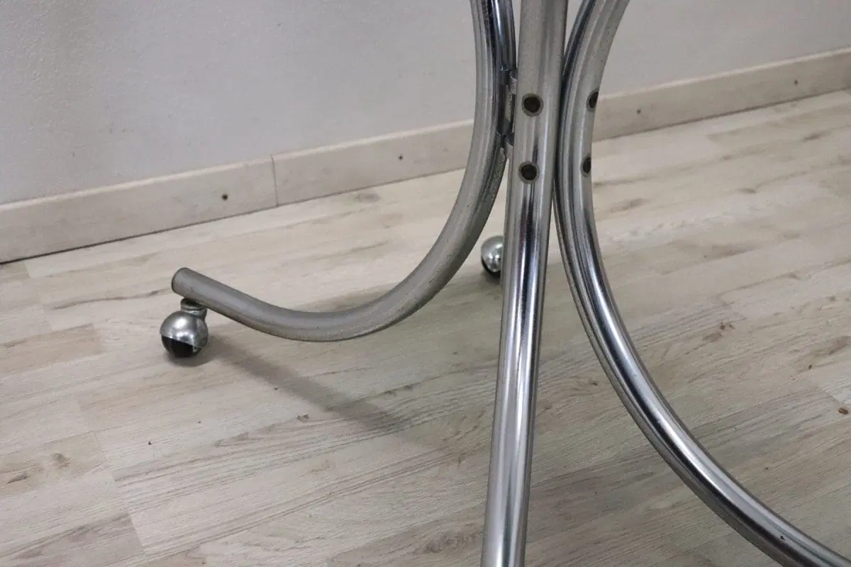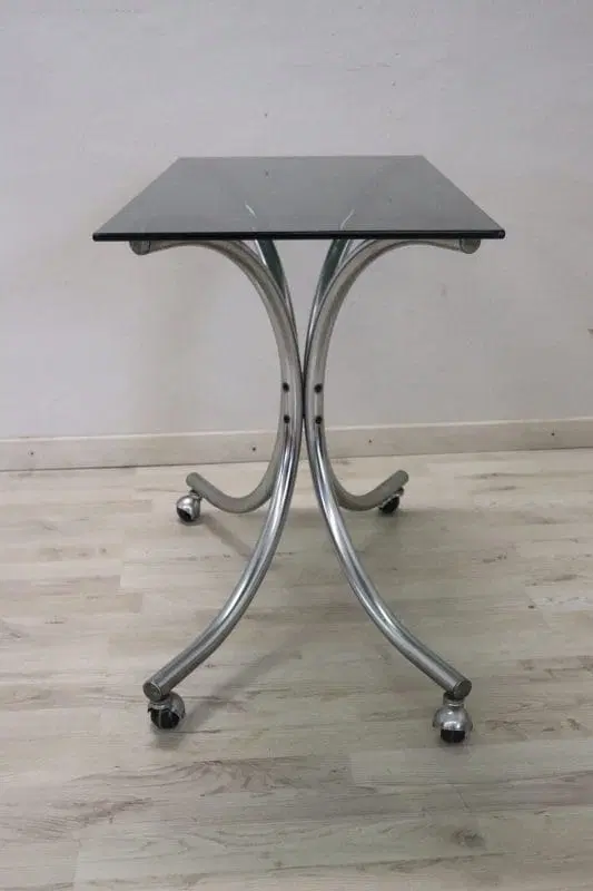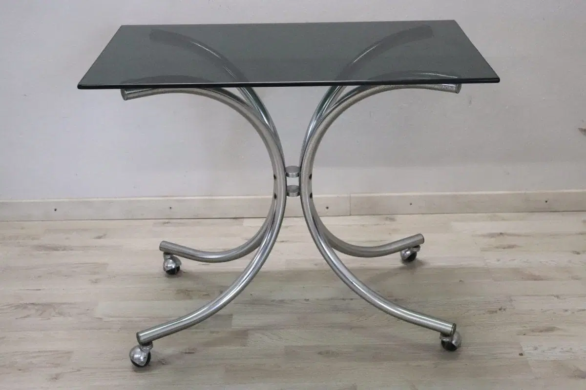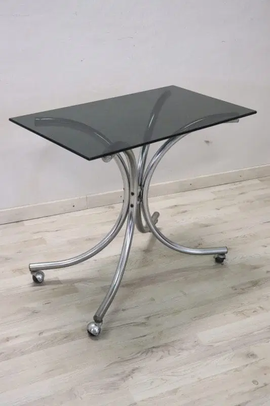 Particolare tavolino o carrello bar vintage da salotto caratterizzato da gambe in metallo cromato e piano in vetro fumè. Rotelline ai piedi perfettamente funzionanti. Databile intorno agli anni ’60. Una vera chicca per arredi vintage ! Articolo ustao in ottime condizioni possibili piccoli segni di usura più che altro sul piano. Vi consigliamo comunque di guardare bene in dettaglio tutte le foto allegate. Proposto ad un’ottimo prezzo comunque trattabile vi invitiamo ad inviarci le vostre proposte di acquisto le valuteremo con piacere.
