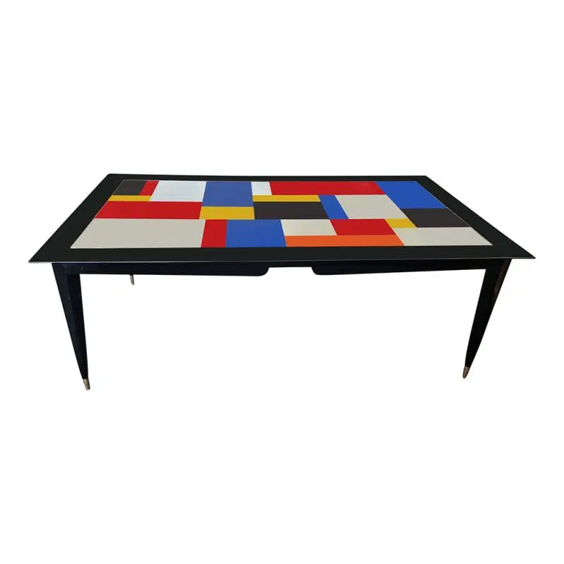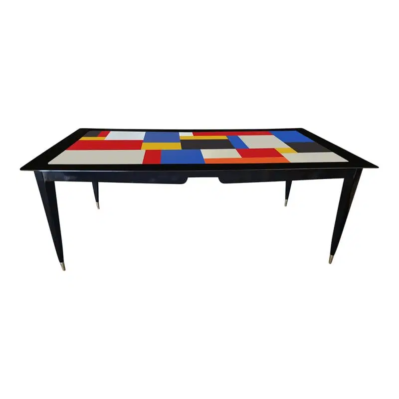 Tavolo in legno laccato nero con piano in vetro colorato profilato in ottone. Gambe a stiletto con finale in ottone.