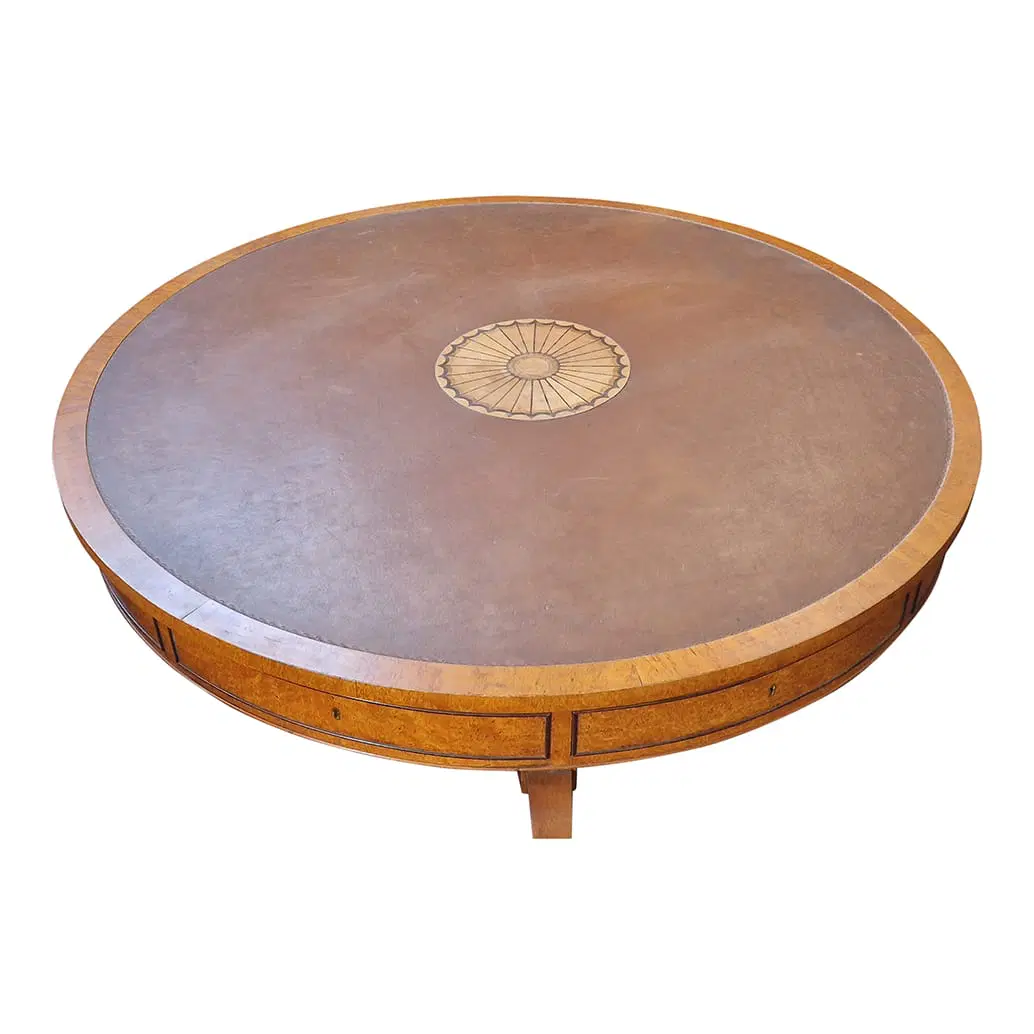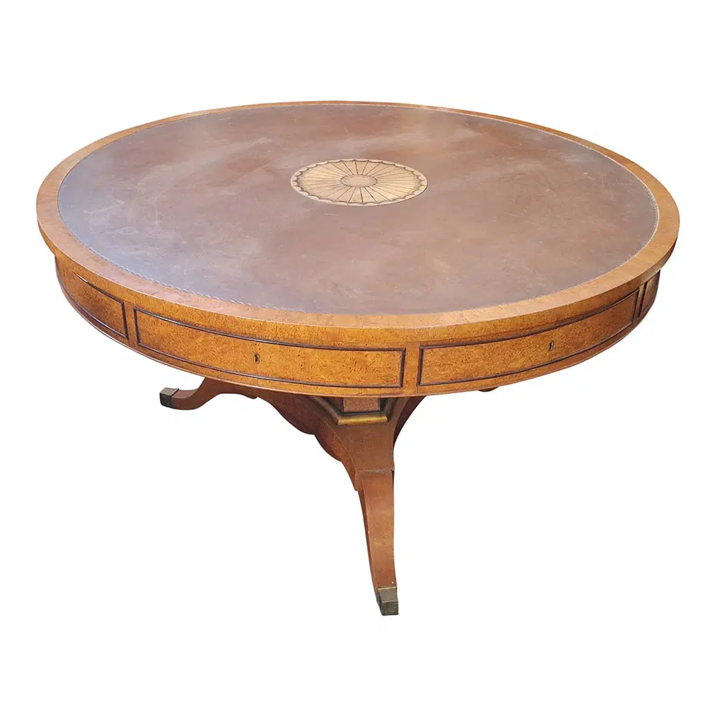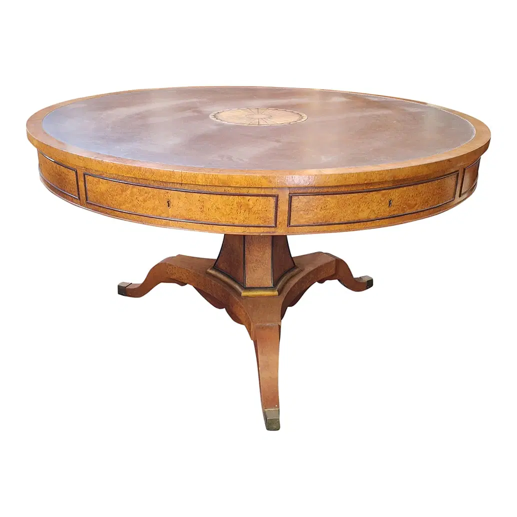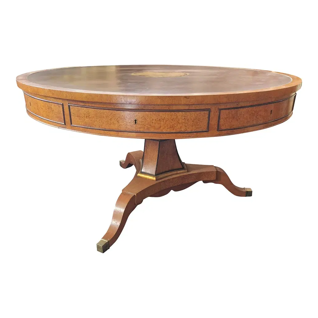 Tavolo tondo in stile impero, in radica di tuja, del XX secolo; piano in legno e cuoio con intarsio centrale in acero, gamba centrale su tre piedini sagomati con terminali in ottone.