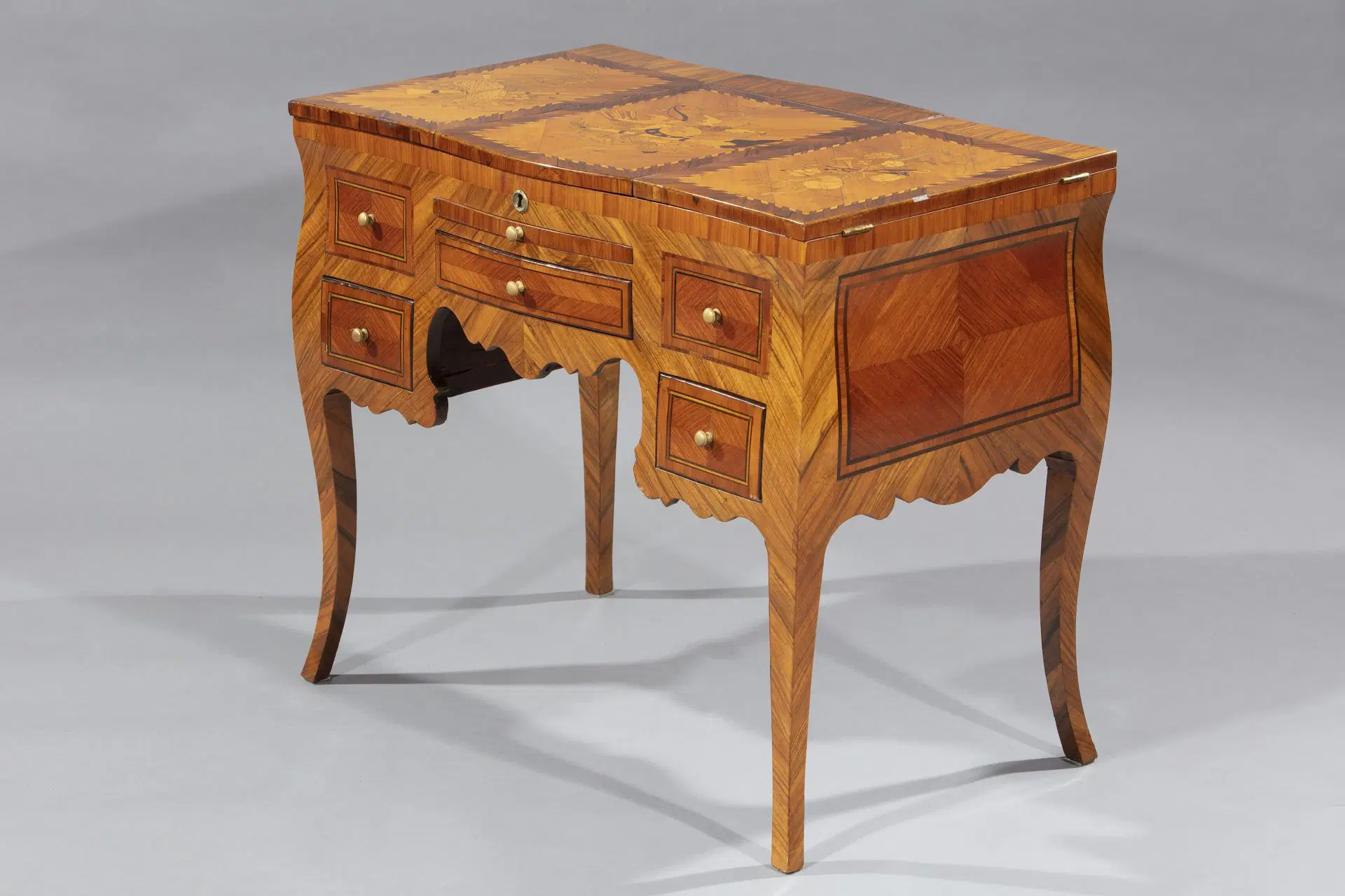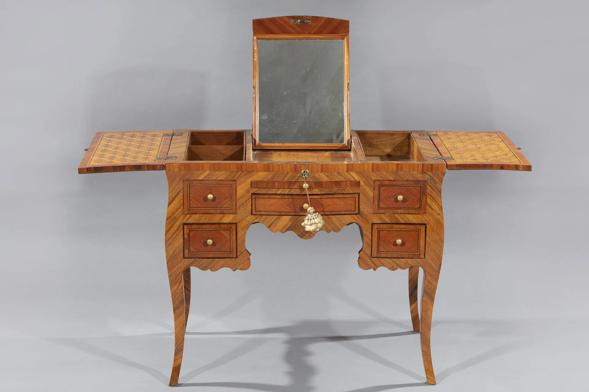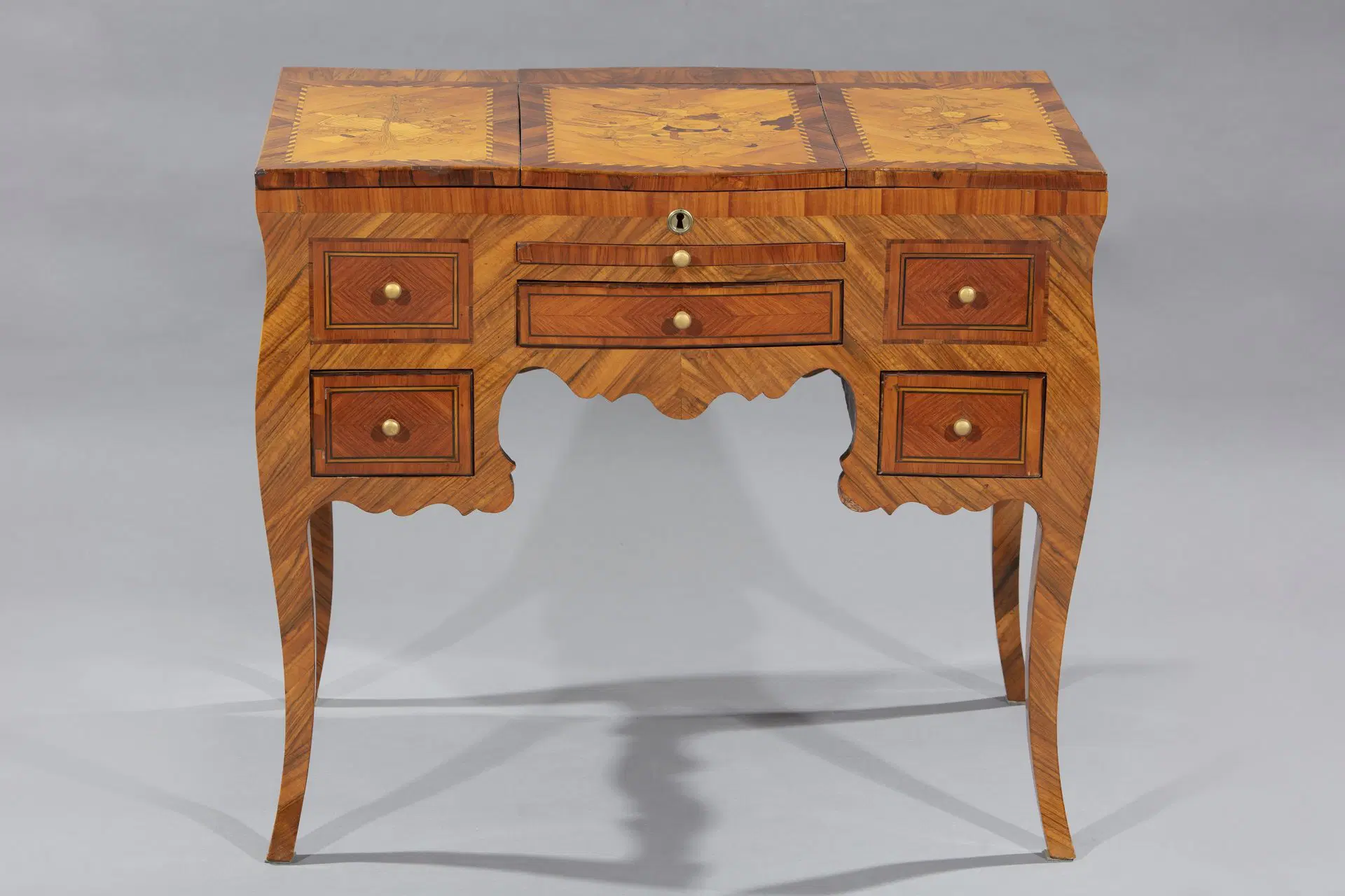 Toilette da centro lastronata e intarsiata in bois de rose e legni diversi, Francia, XVIII secolo.