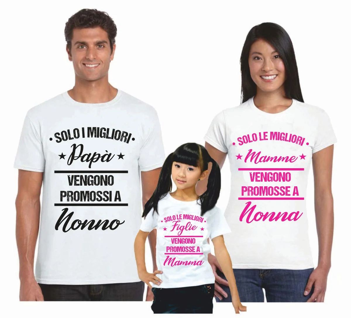 Tris T-Shirt Magliette Famiglia. Vesti la tua famiglia con questa simpatica idea regalo, un tris di magliette ideale per festeggiare in maniera divertente la festa del papà, la festa della mamma, i compleanni, qualsiasi ricorrenza o semplicemente per passare in allegria le giornate in famiglia.