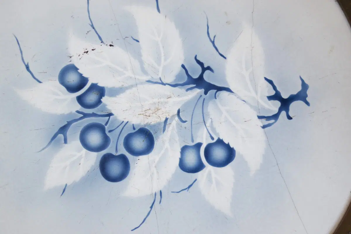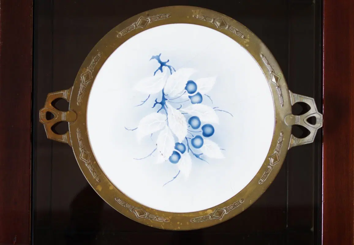 Centro : un piatto in ceramica decorato con un delicato motivo dipinto a mano che raffigura morbide bacche blu e fogliame bianco, evocando un’estetica serena e raffinata.