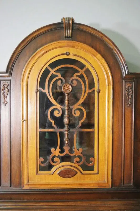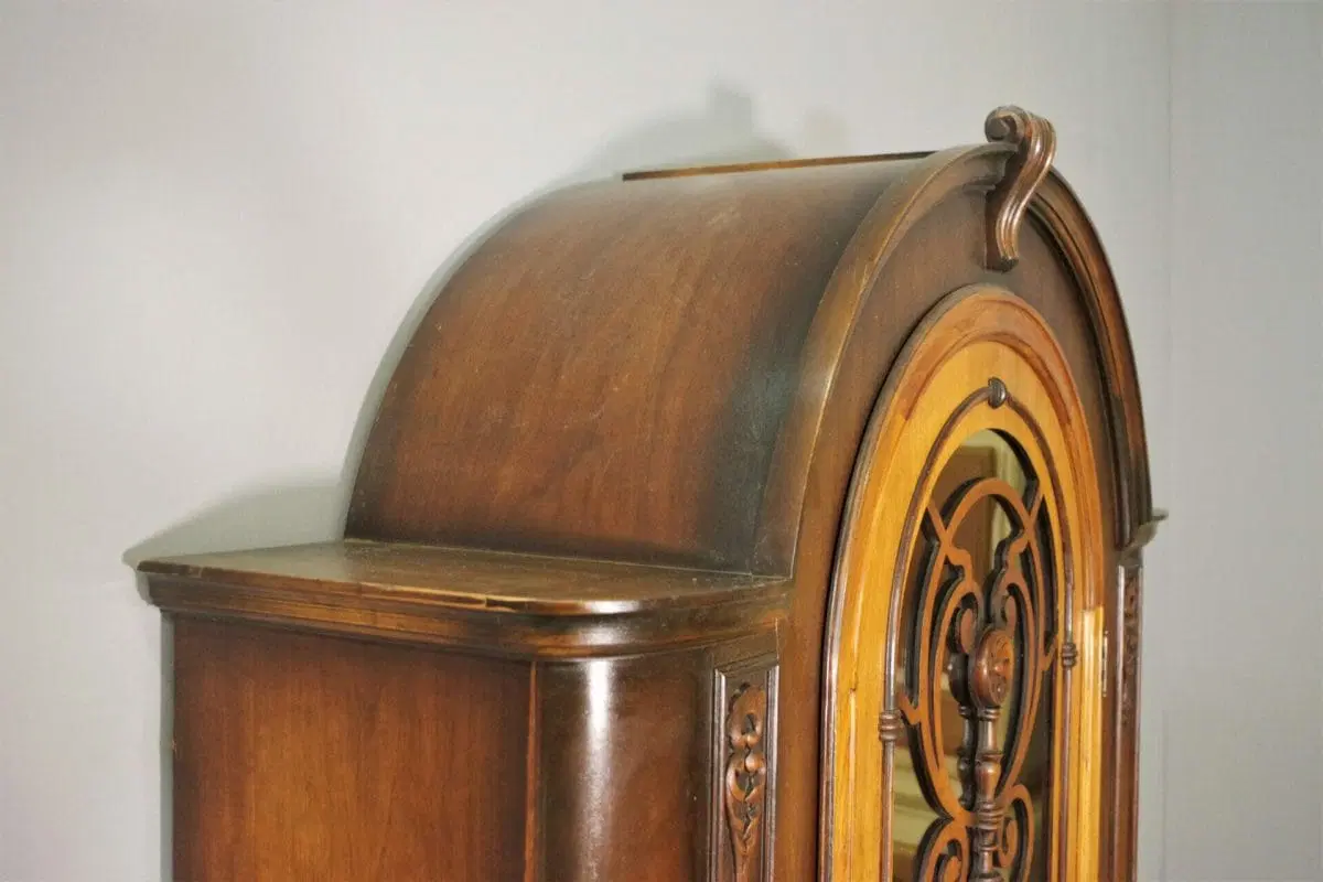 Vetrina in legno di faggio e ciliegio tinta noce intagliato lavorato a mano, con cassettone anni ’20 a forma di radio.