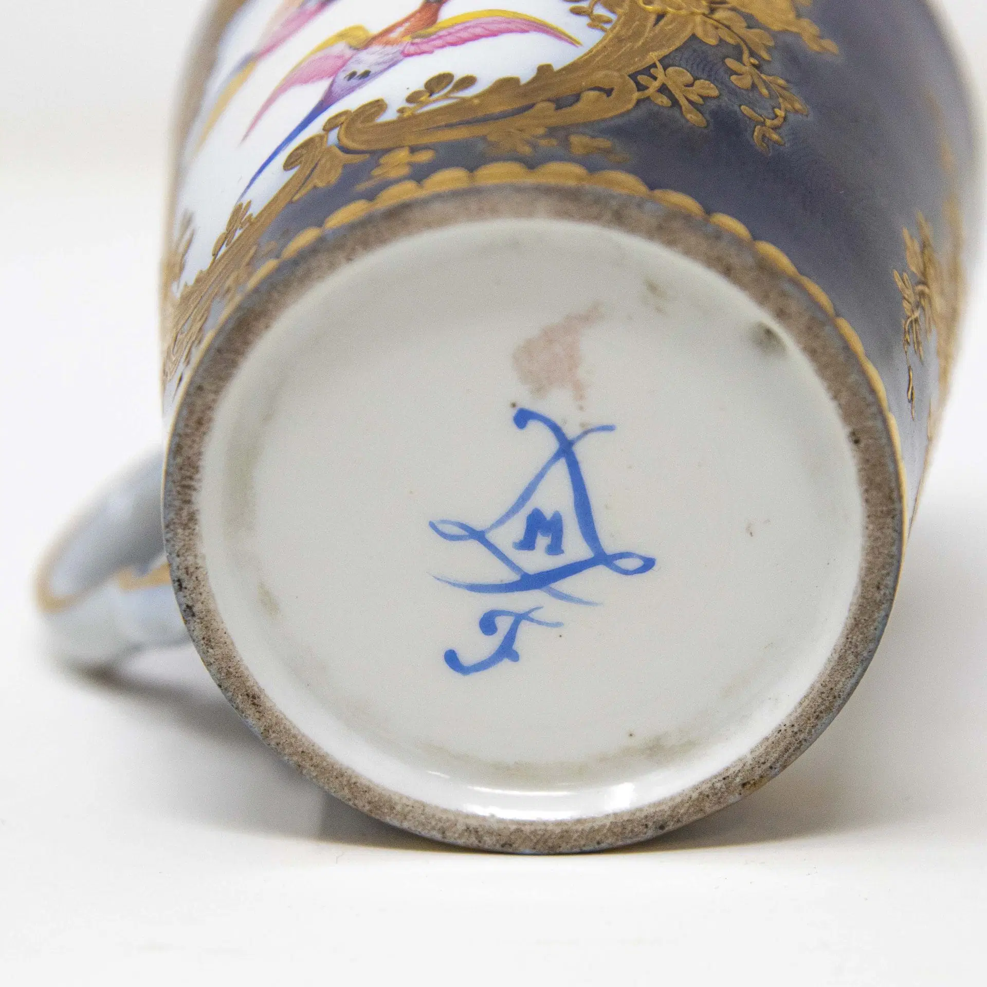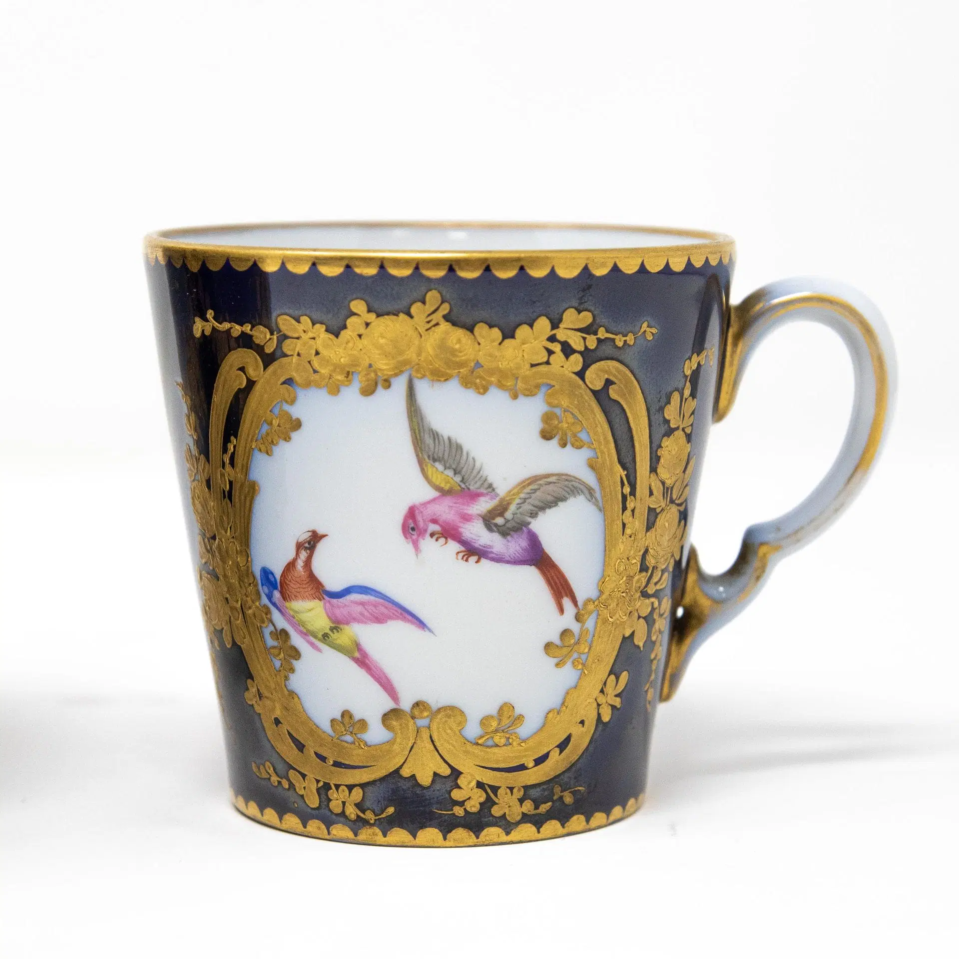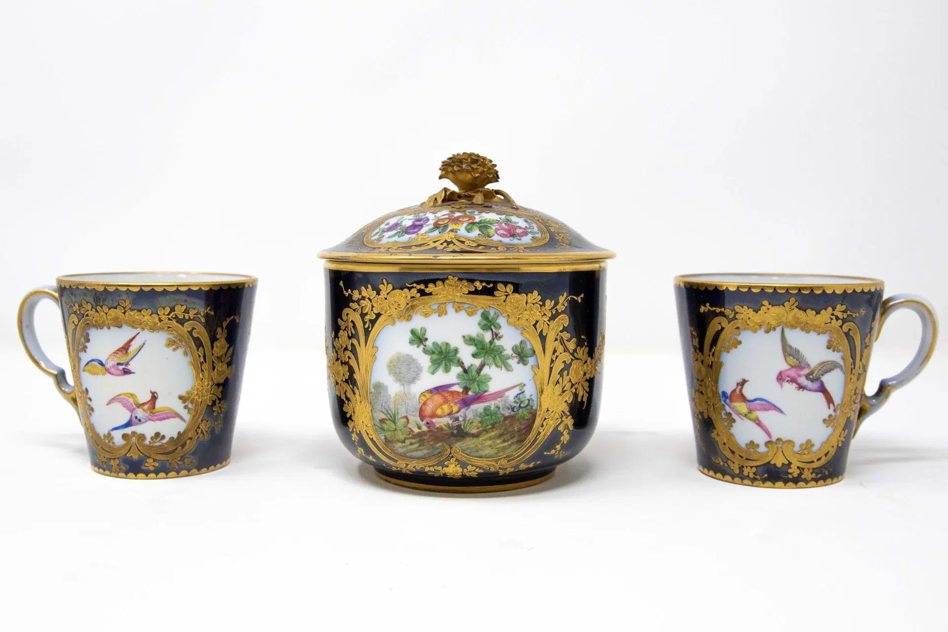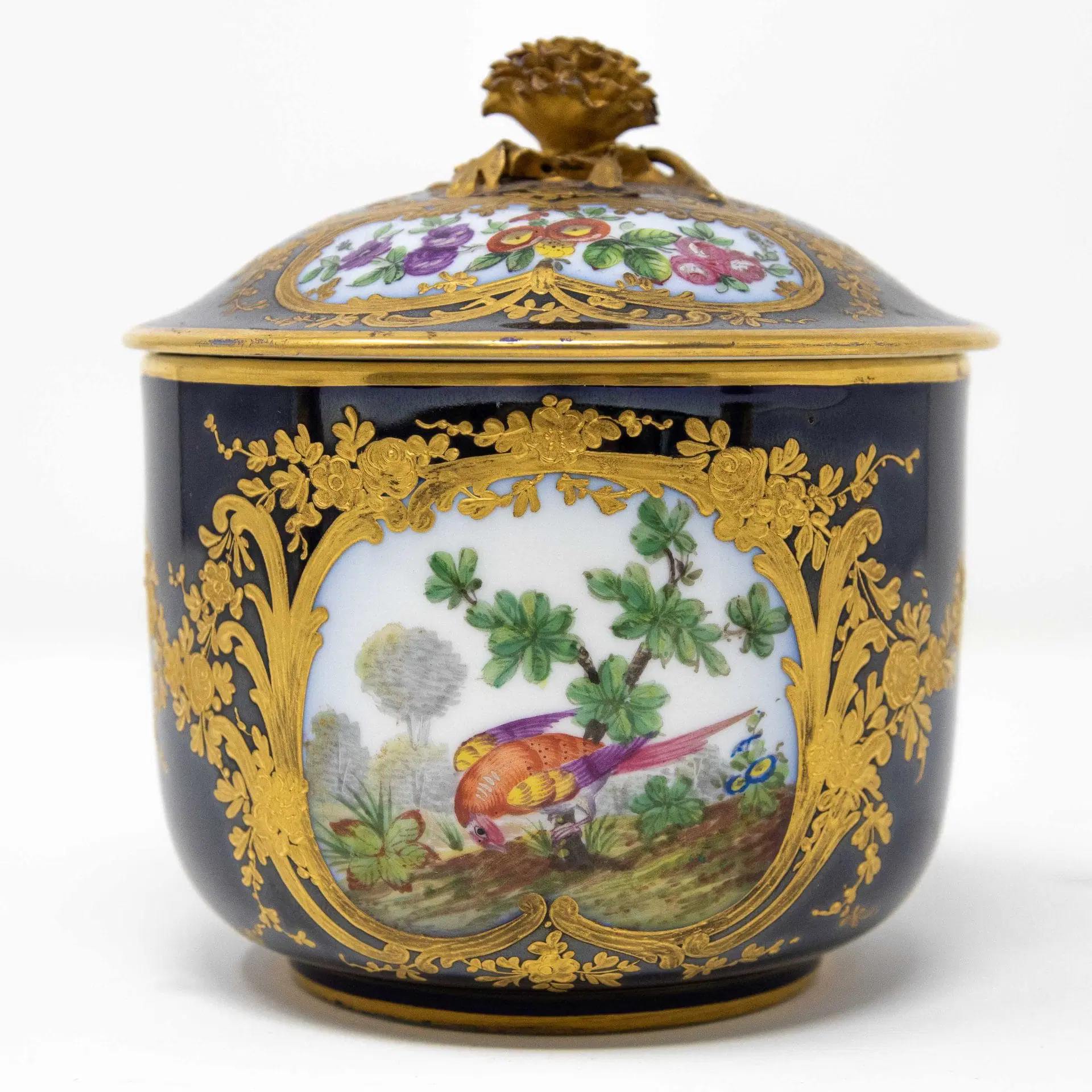 Porcellana a fondo blu decorata in rilievo a dorature e riserve policrome con trionfi floreali e volatili in paesaggi