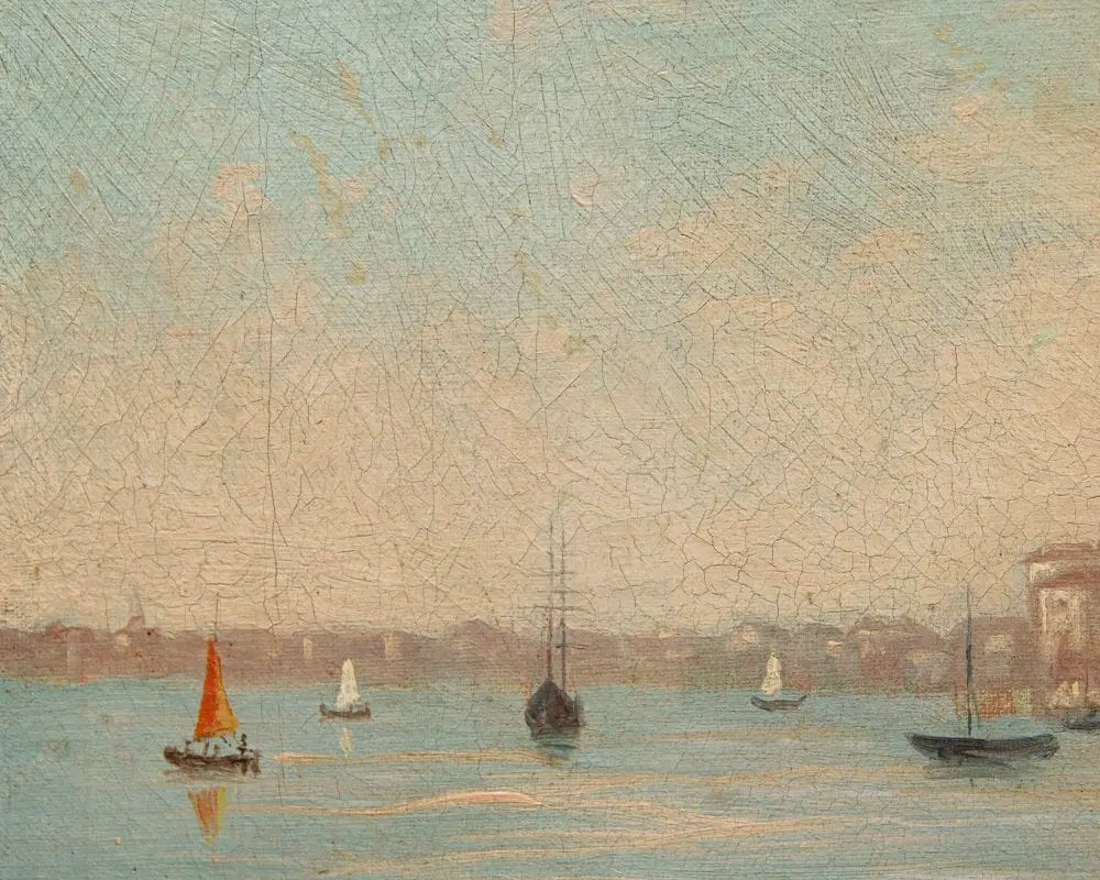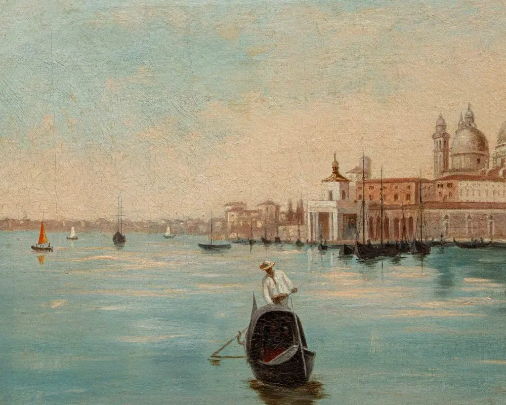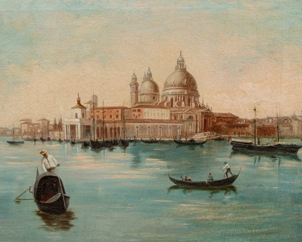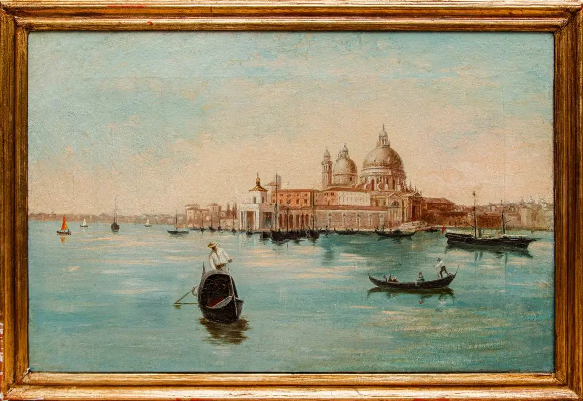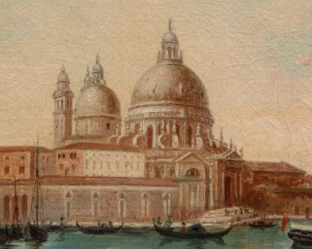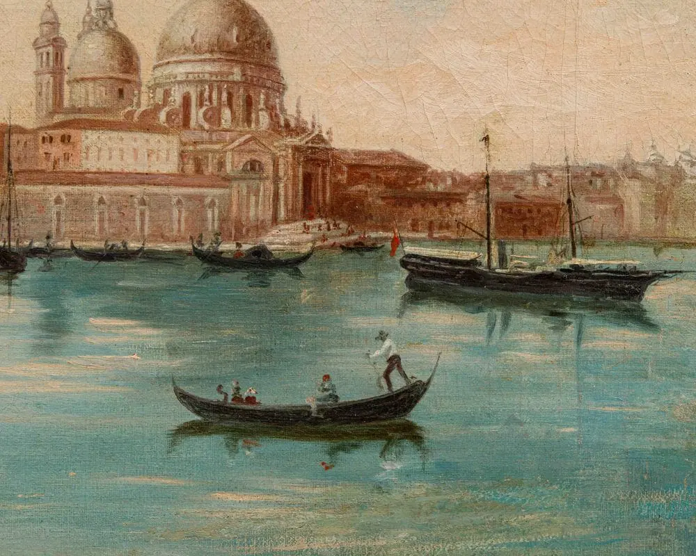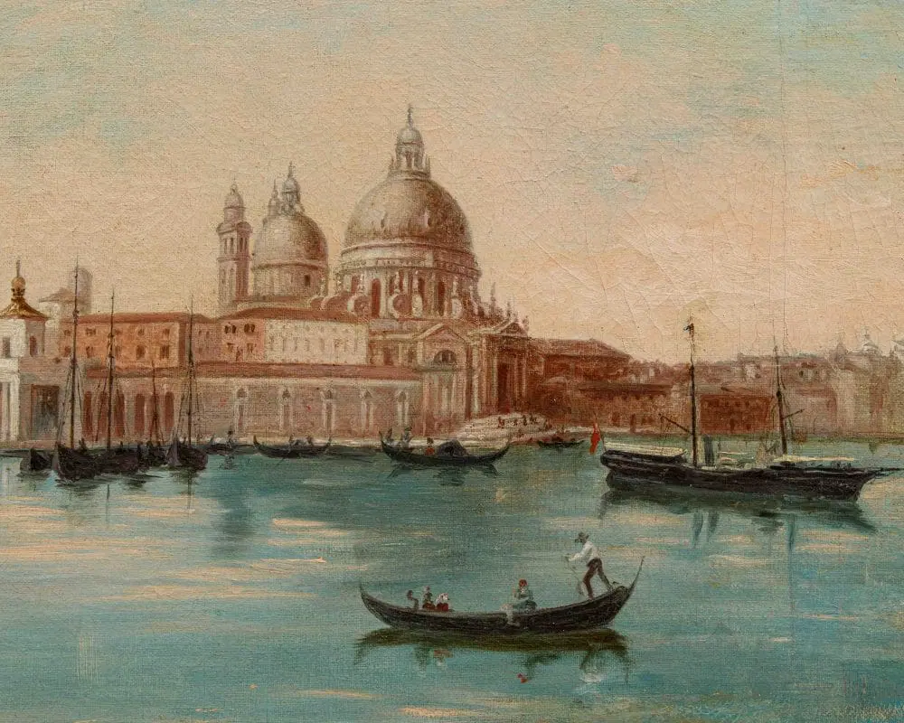 Il dipinto in esame, caratteristico della corrente vedutista che andò sviluppandosi nel corso del XIX secolo in Italia e all’estero, raffigura una veduta di Venezia, con particolare attenzione a Punta della Dogana e alla Basilica di Santa Maria della Salute. L’opera cattura l’atmosfera unica della città lagunare, con le sue acque scintillanti, le gondole che solcano i canali e i palazzi che si riflettono sull’acqua. Il termine Vedutismo derivava proprio dal soggetto principale rappresentato, le cosiddette vedute, cioè suggestive panoramiche impresse su tela dai grandi pittori dell’epoca. Esse si differenziavano dai precedenti quadri di paesaggio proprio per la loro natura fortemente realistica, la loro quasi maniacale attenzione al dettaglio e la totale preponderanza dell’elemento paesaggistico: precedentemente al vedutismo, infatti, i paesaggi erano pressoché utilizzati esclusivamente come panorami, cioè sfondo per la rappresentazione di uomini, donne o animali, che rimanevano al centro della scena. Questa nuova corrente artistica portò invece proprio il paesaggio ad assumere il ruolo di protagonista dell’opera. Le ragioni di tale successo sono da cercarsi soprattutto nell’usanza del Grand Tour, il viaggio compiuto dai giovani rampolli della nobiltà europea alla scoperta del continente, che aveva come meta preferita proprio l’Italia: Firenze, Roma, Napoli e ovviamente Venezia, la città più in voga di tutto il Settecento, dove gli inglesi rimasero estasiati dal “decadente fascino italiano”. I principali fautori del vedutismo erano soliti utilizzare la camera ottica, preziosissimo strumento che permetteva di rappresentare la realtà in maniera lenticolare. A Venezia, il vedutismo mostrò segni sorprendenti di originalità, proiettandosi tra visioni anticipatrici del romanticismo e l’assoluta fedeltà al dato reale, naturale o architettonico, grazie anche a protagonisti come Canaletto, Francesco Guardi e Bernardo Bellotto. I meravigliosi paesaggi sulla laguna ed i monumenti e palazzi unici che la popolano erano, infatti, un meta imperdibile per i nobili dell’epoca ed un soggetto insostituibile per i pittori vedutisti. In questo caso, l’artista concentra la sua attenzione sullo scorcio della Punta della Dogana (nota anche come Punta della Salute o Punta da Màr), una sottile lingua triangolare di divisione tra il Canal Grande e il Canale della Giudecca, prospiciente il Bacino San Marco ed ospitante l’iconica Basilica di Santa Maria della Salute, progettata da Baldassarre Longhena nella prima metà del Seicento, qui ben visibile. La sua costruzione nacque come voto solenne della Serenissima alla Vergine Maria, che si narra avesse fondato la città nel 421 d.C., in ringraziamento per la fine della terribile epidemia di peste del 1630-1631 che decimò la popolazione veneziana: non è un caso che moltissimi artisti decisero di ergerla a protagonista delle loro tele, manifestando attraverso colori cangianti ed atmosfere romantiche e decanti questo legame profondo con un luogo di grande devozione e spiritualità.