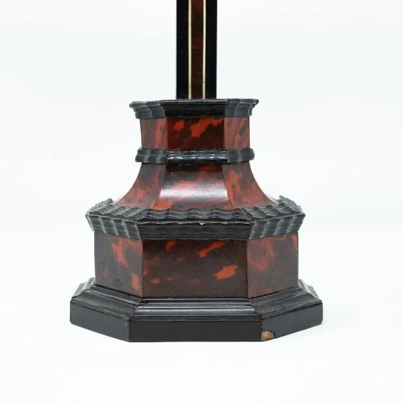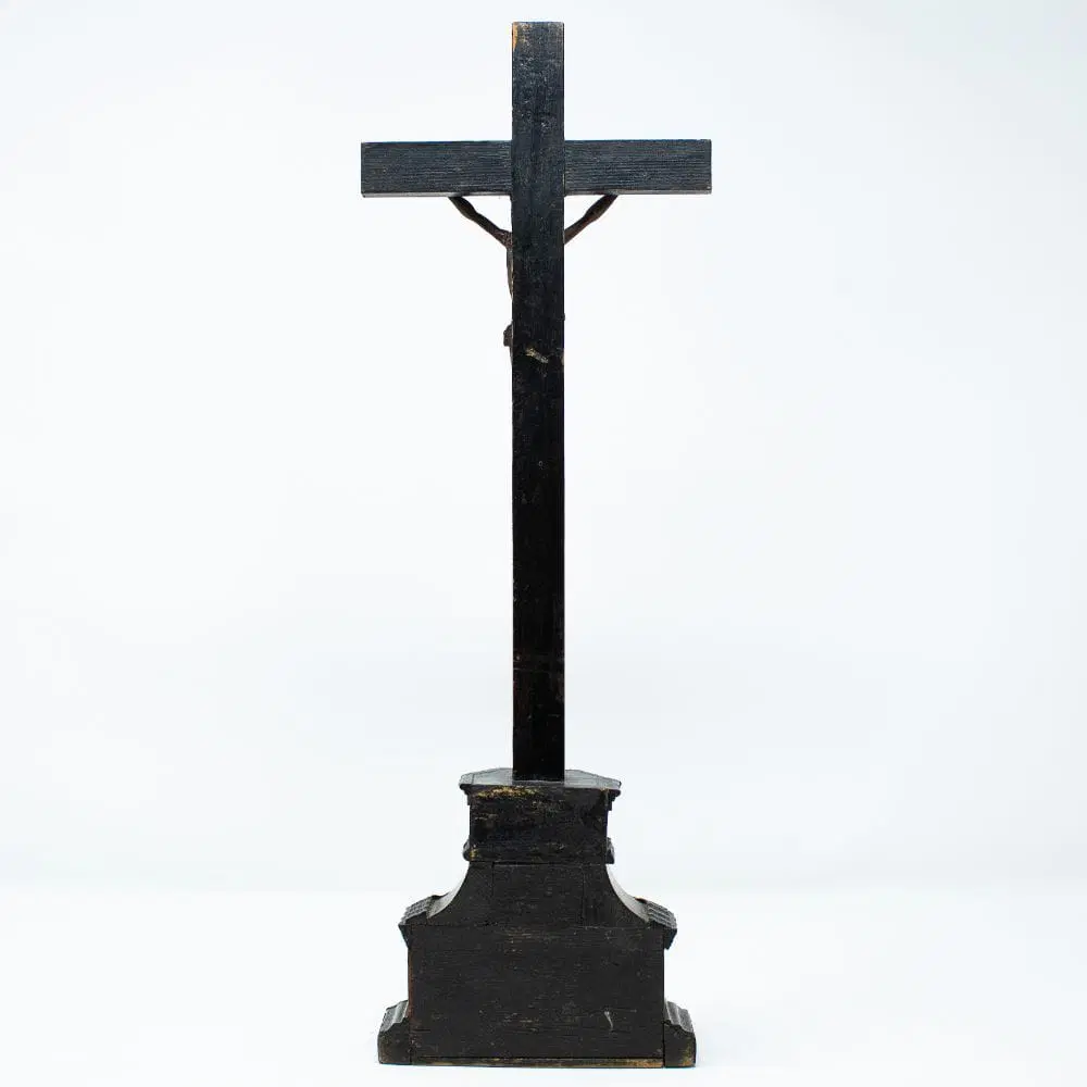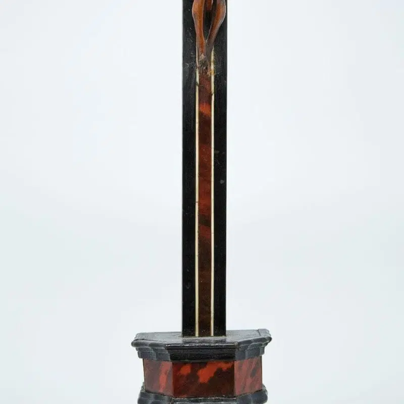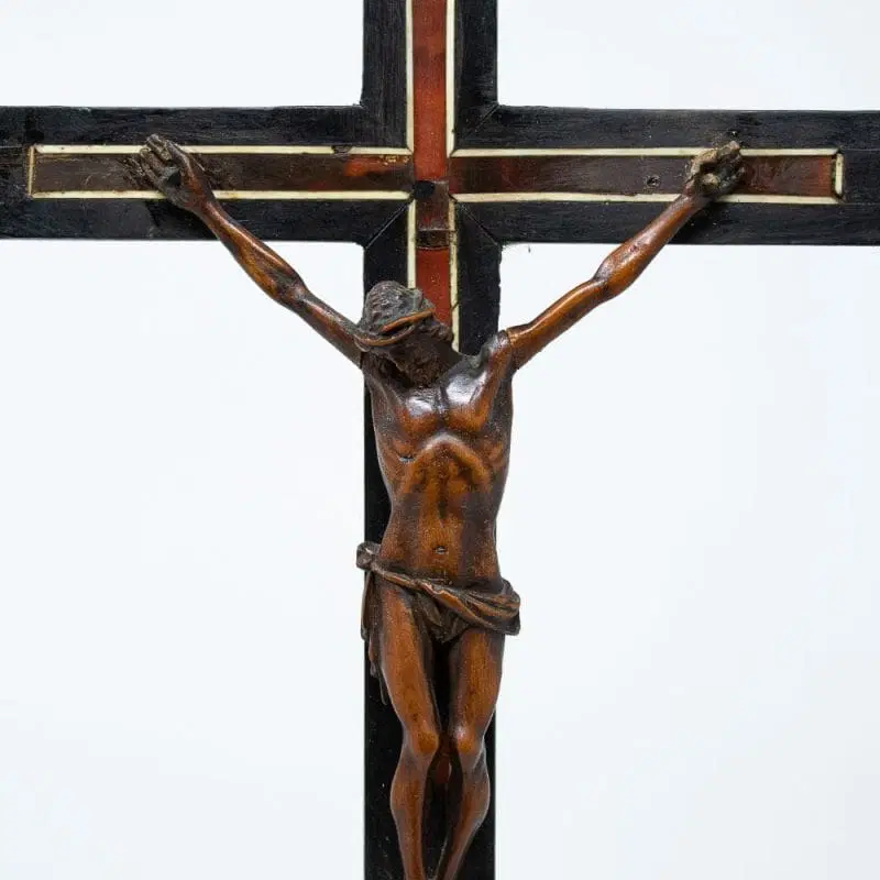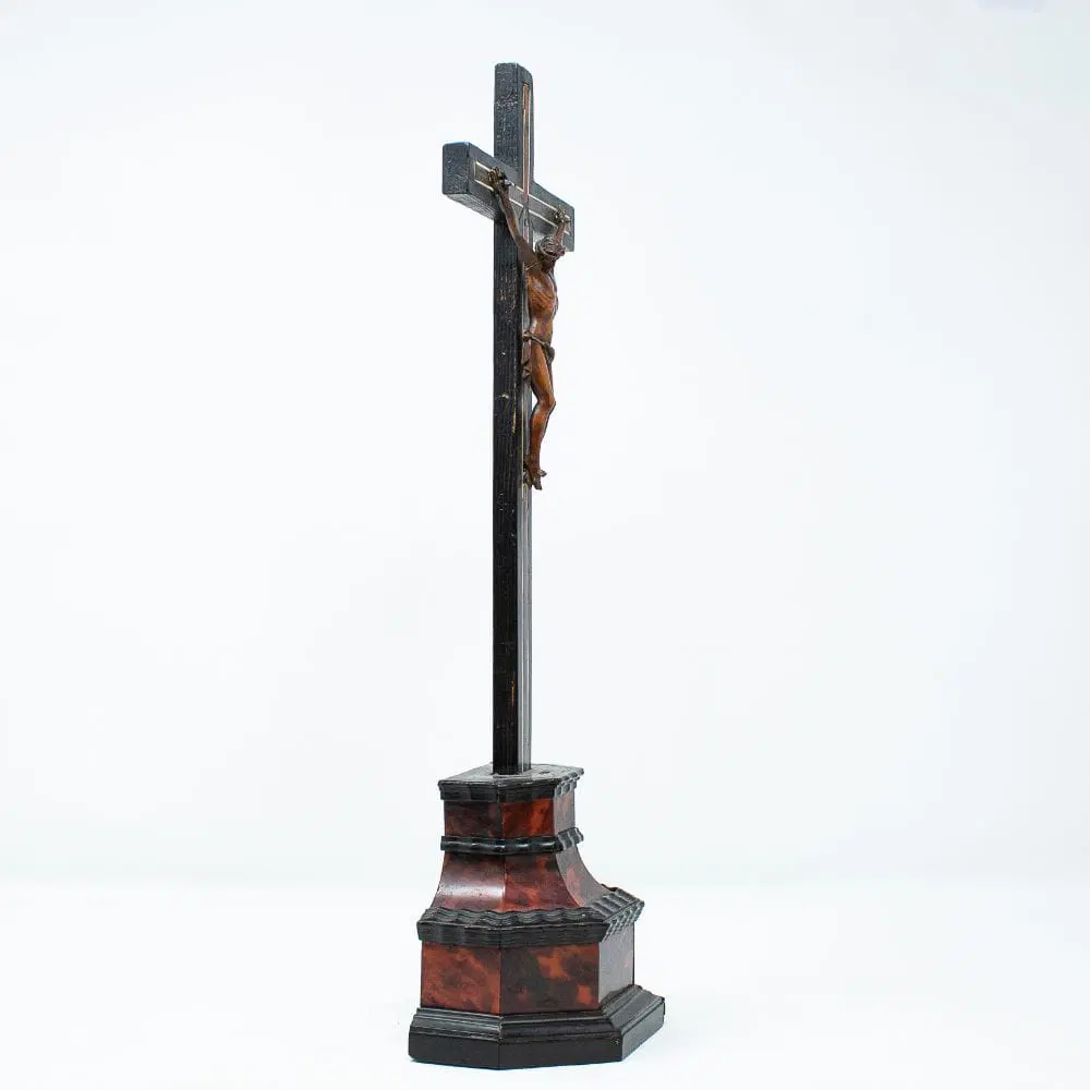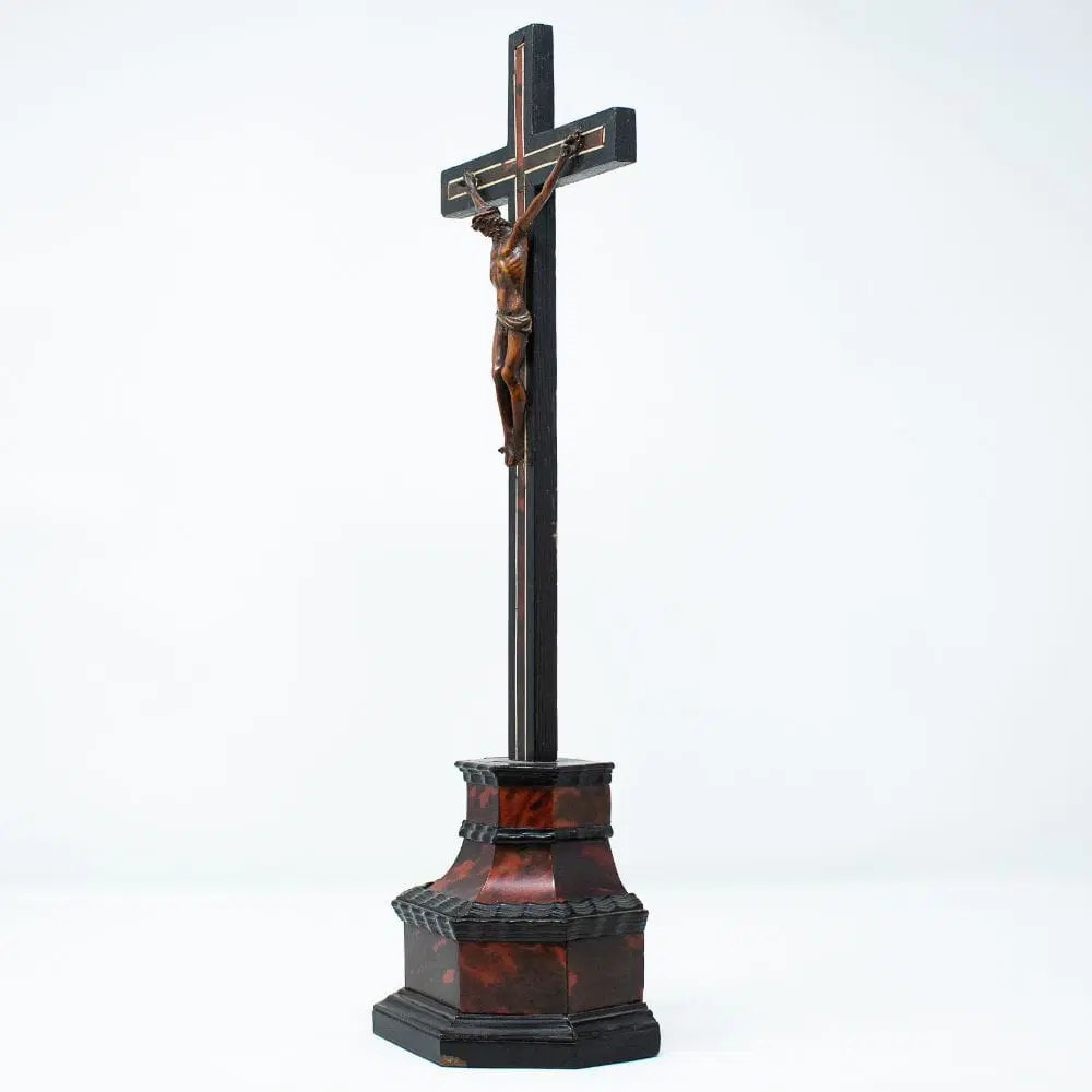 La scultura raffigurante Cristo crocifisso qui esaminata rappresenta un raffinato esempio di ebanisteria seicentesca in bosso. La figura del Cristo, ormai morto sulla croce, risulta parte di una preziosa coreografia artistica con la struttura della croce e del suo piedistallo, entrambi decorati da specchiature in tartaruga, filettature in avorio a sottolineare la struttura della croce ed elementi in legno ebanizzato ed intagliato ad evidenziare la struttura architettonica del piedistallo.
